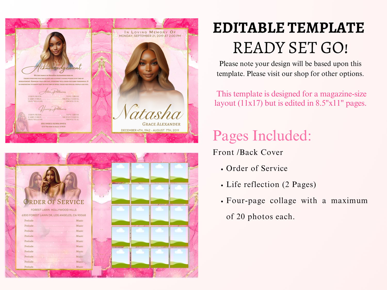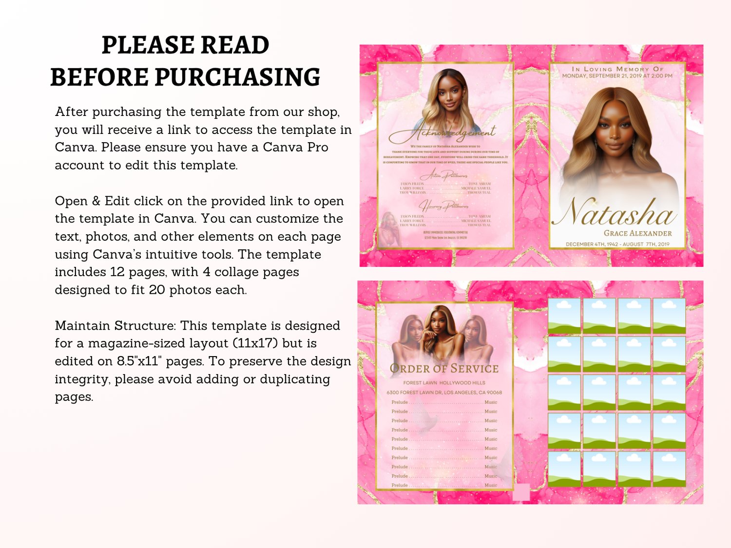 💗 12-Page Editable Obituary Template – Pink Marble Elegance