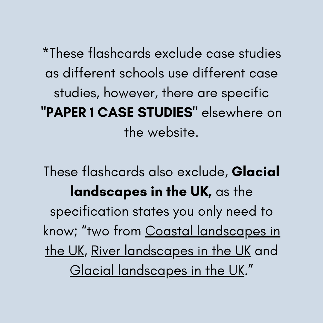 These flashcards also exclude, Glacial landscapes in the UK, as the specification states you only need to know; “two from Coastal landscapes in the UK, River landscapes in the UK and Glacial landscapes in the UK.”