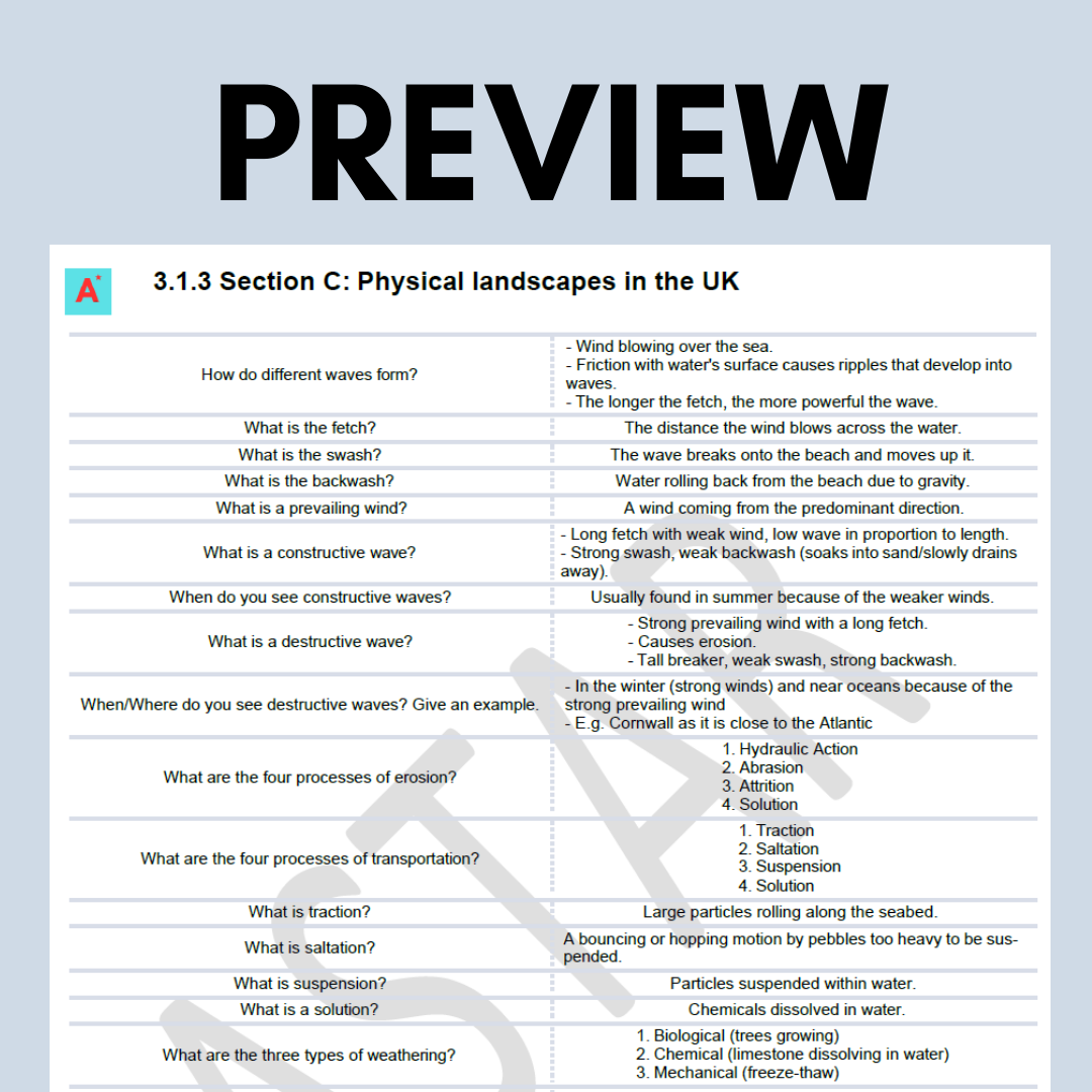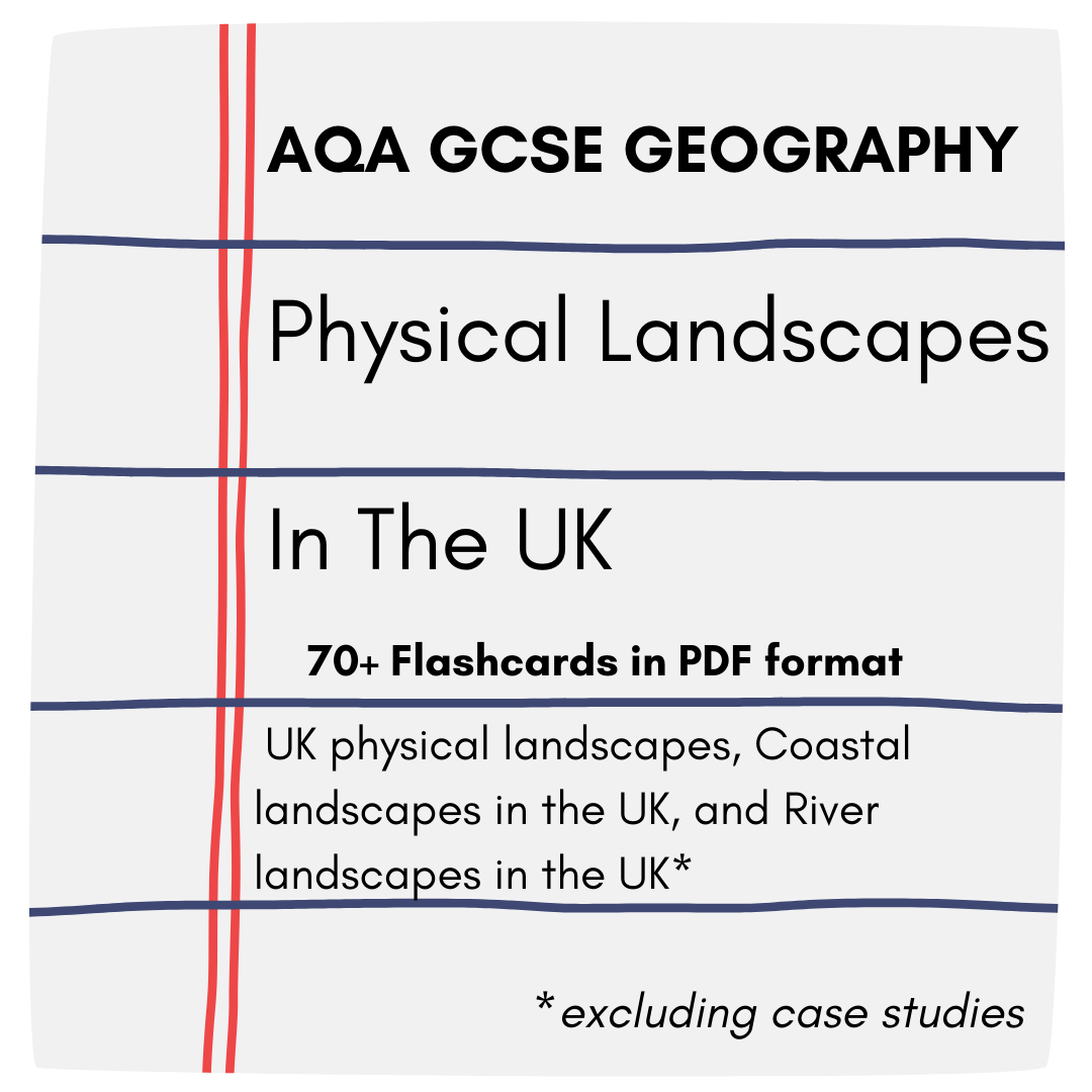 In PDF format, you will receive flashcards comprehensive covering AQA Geography GCSE Section C Physical Landscapes in the UK.