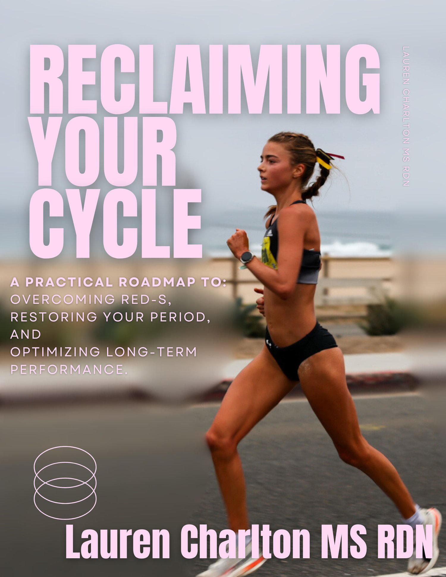 Written by Lauren Charlton, MS, RDN — an Advanced Sports Dietitian and endurance runner, "Reclaiming Your Cycle" is an 85+ page, evidence-based resource that walks you through every phase of period recovery in female athletes affected by RED-S (Relative Energy Deficiency in Sport).