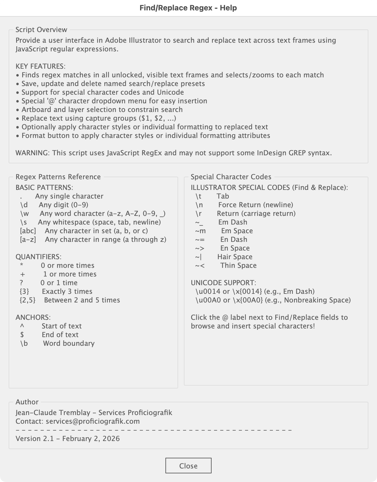 This script provides a comprehensive user interface in Adobe Illustrator to search and replace text using regular expressions (regex). It enables precise text manipulation across multiple text frames with advanced pattern matching capabilities that go far beyond Illustrator's built-in Find and Replace functionality.