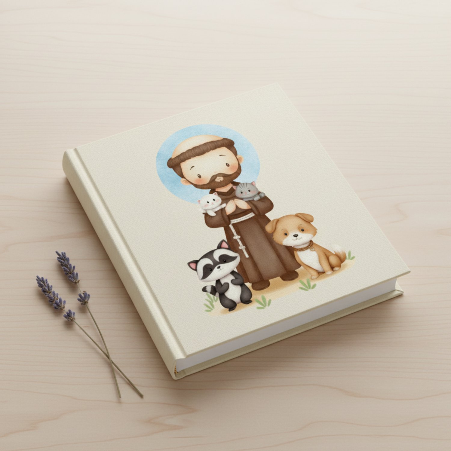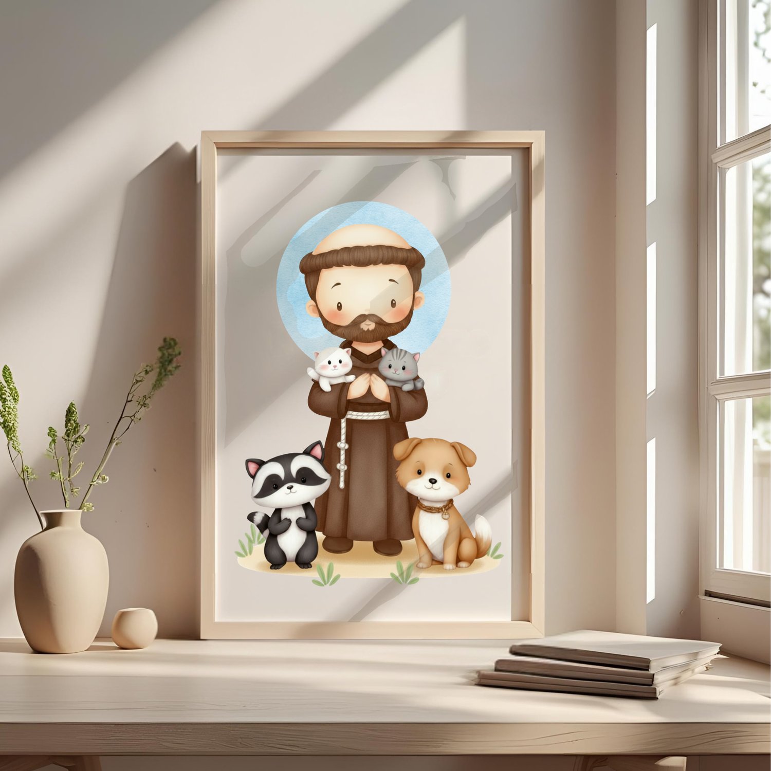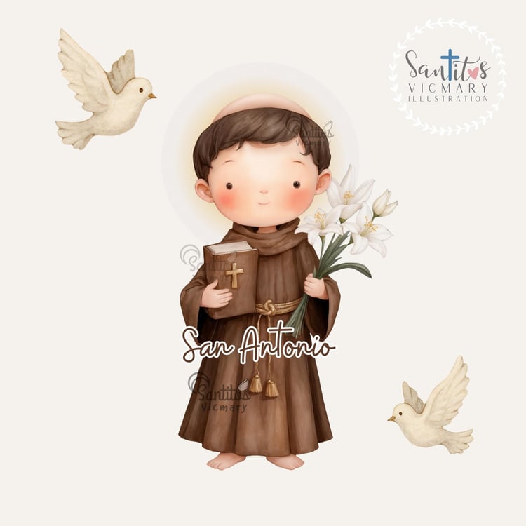 ¡Un hermoso Icono Digital de San Francisco de Asís en un dulce estilo kawaii, perfecto para celebrar al patrón de los animales y la ecología!