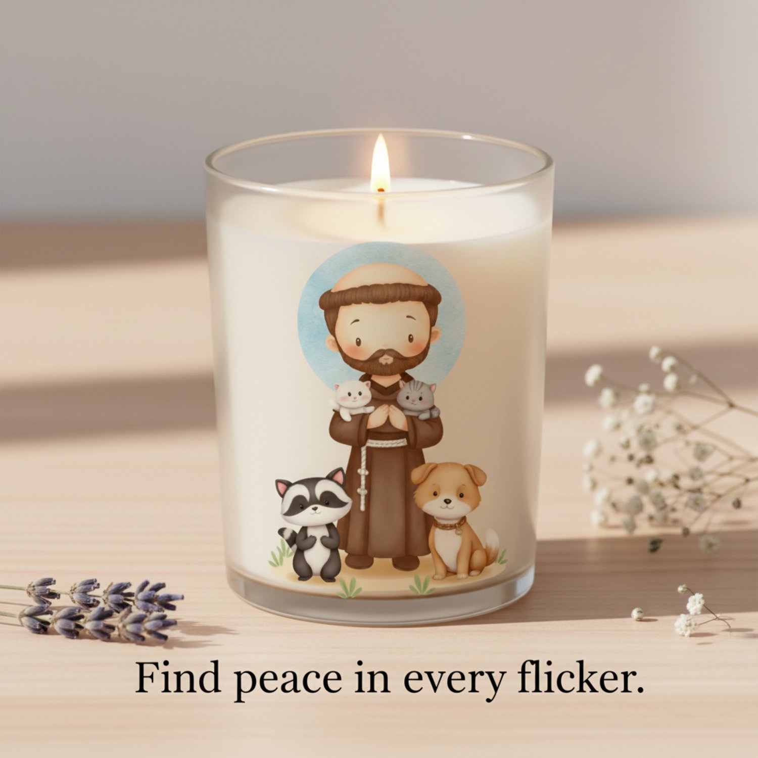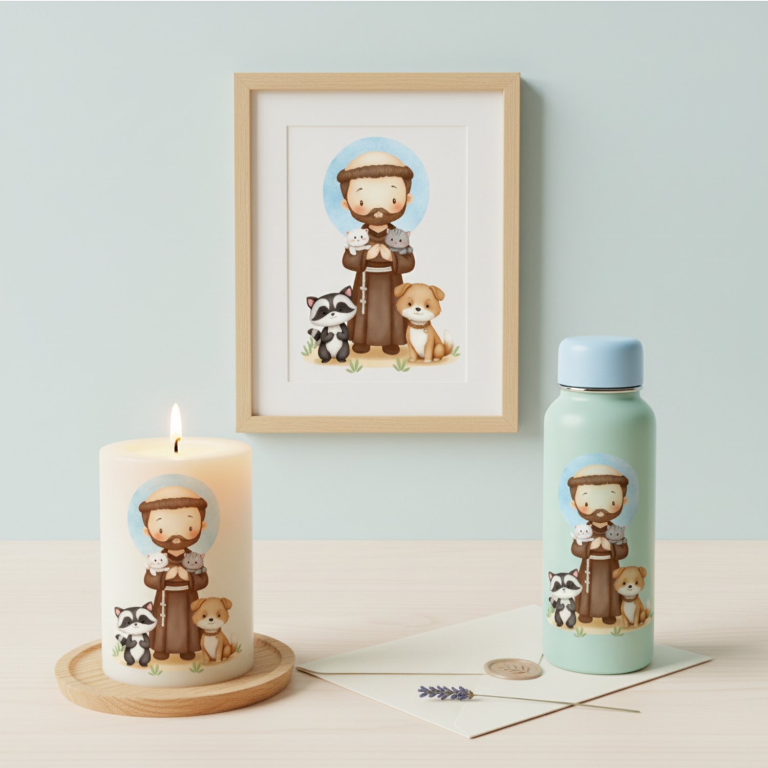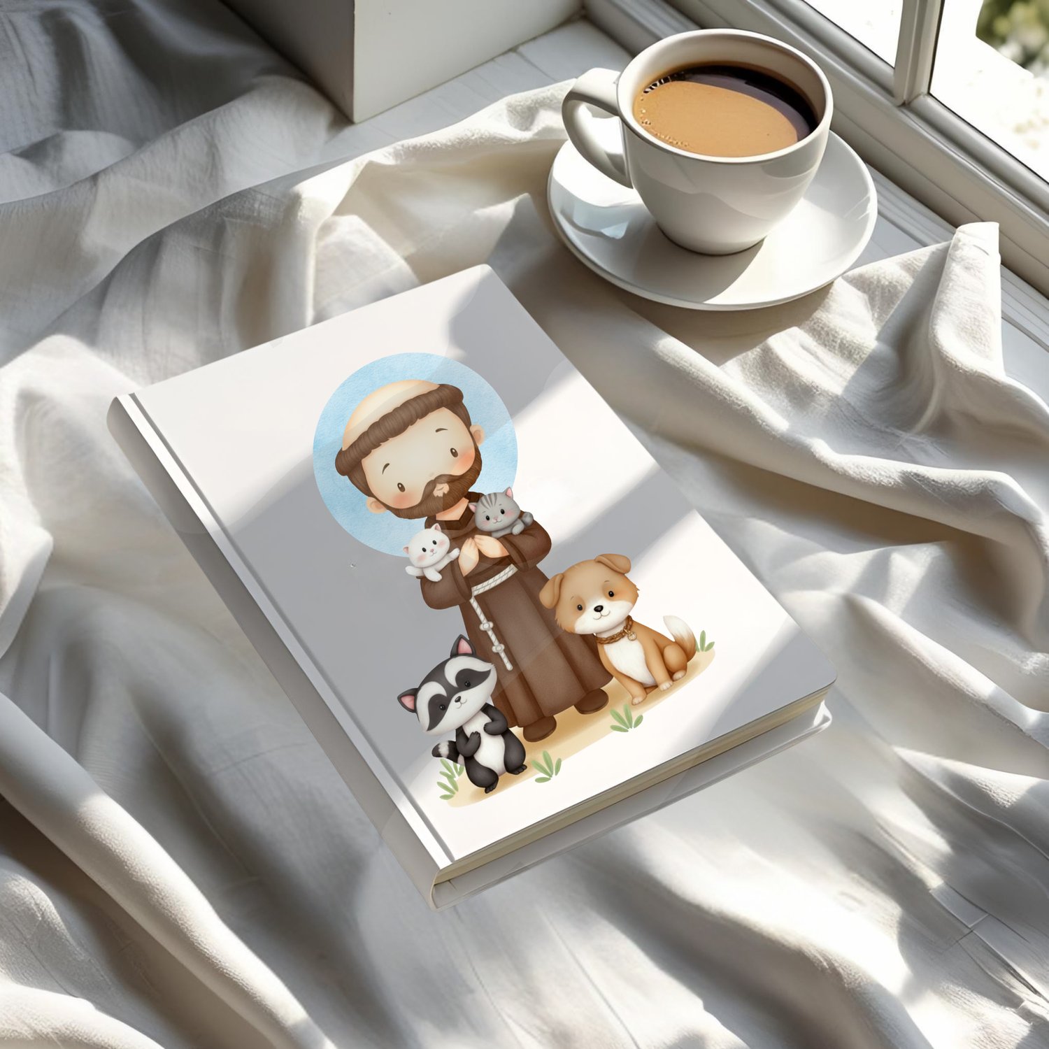 ¡Un hermoso Icono Digital de San Francisco de Asís en un dulce estilo kawaii, perfecto para celebrar al patrón de los animales y la ecología!