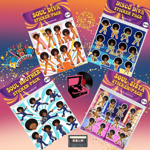 This Soul Collection Sticker Pack is a bold, retro-inspired set celebrating classic soul, disco, and funk energy with adorable chibi-style characters. An added bonus, you will receive the link to the generator.