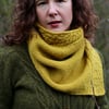 Taisce (Irish for treasure or hoard) is a large cowl shaped to imitate the coverage of a triangular shawl about the neck. Taisce is inspired by items from the Treasury in the National Museum of Ireland. It features a cabled panel, which hangs diagonally, against a background of cosy garter stitch. The pattern is worked flat and seamed. It begins with just a few stitches, with gradual increases, and short rows to shape the piece. It uses integrated I-cord edges, and an I-cord bind off.
