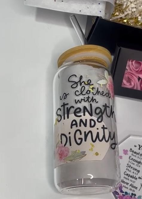 🌸 Elegant & Functional – A 16oz glass cup with a bamboo lid and glass straw, adorned with a beautiful floral design and the message: "She is clothed with strength and dignity."