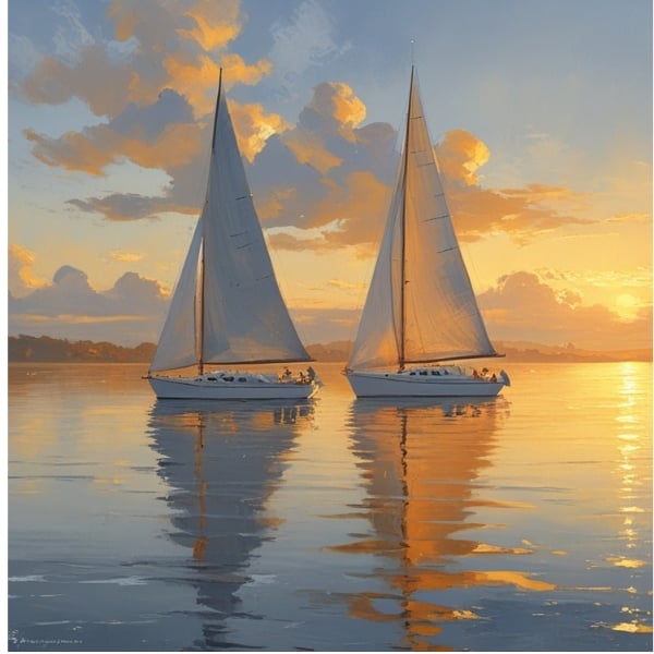A captivating painting that radiates peace and elegance, featuring four sailboats gliding gracefully across calm waters reflecting the golden hues of the setting sun. Rendered in a contemporary impressionist style, the artwork blends expressive brushstrokes with shimmering highlights to create a dreamlike scene that balances reality and imagination.