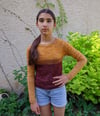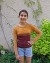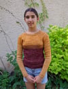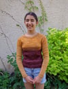 Il est tricoté de haut en bas, avec des emmanchures raglan et une encolure légèrement creusée sur le devant.