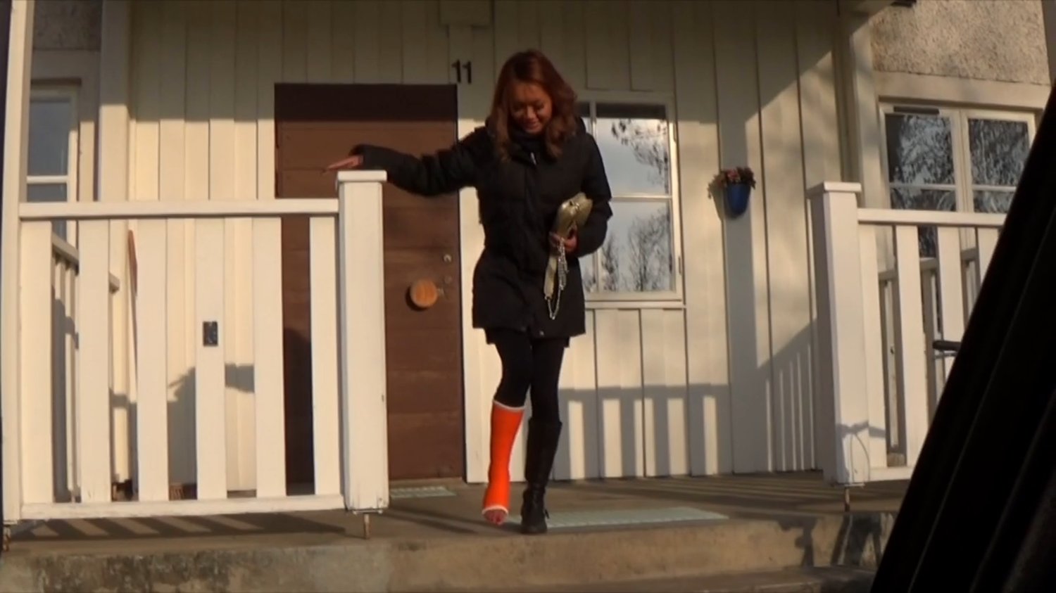 Bunny jumps out from her house to the waiting car on one leg.She is on her way to the mall and we see her crutch around with her orange SLC and even if it´s Halloween time so has Bunny no sock over her toes. We later in the clip get some great closeup of the cast and her painted toes.