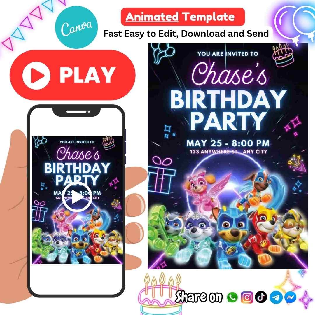 Neon Paw Patrol Digital Animated Birthday Invitation | Instant Download