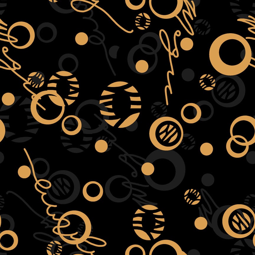 Dynamic abstract pattern featuring layered circles, zebra-striped spheres, and calligraphic linework on a deep black background.