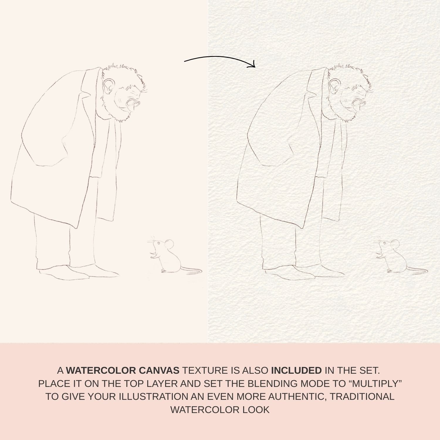 What's inside: 🎨 Versatile watercolor brushes with natural texture variation 🎨 Watercolor stamp brushes for expressive marks 🎨 Paper and pencil texture brushes for a mixed-media feel 🎨 Blending brushes for smooth, natural transitions 🎨 Watercolor paper canvas — place on top layer, set to Multiply, paint beneath for an authentic traditional look