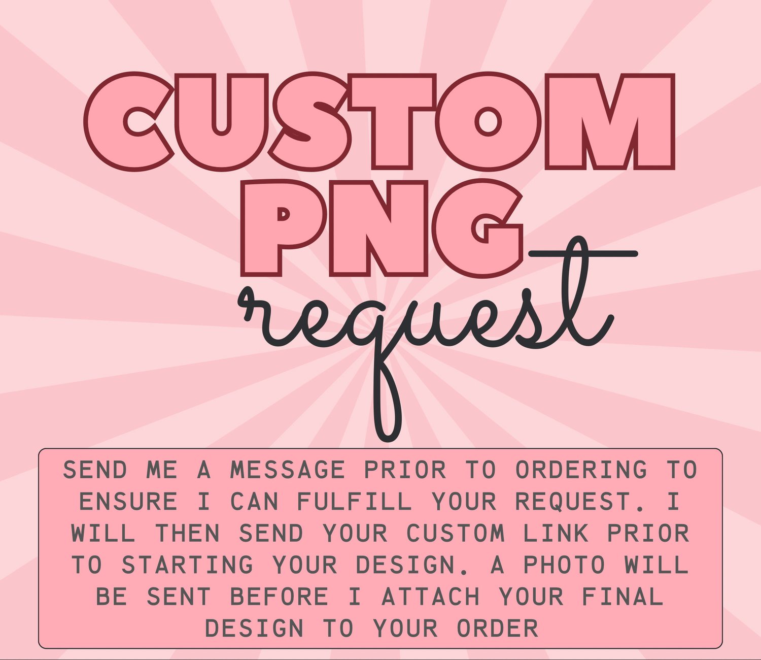 This is a CUSTOM listing for PNG's only. Please send me a message at customerserviceebe@gmail.com prior to ordering with your request on an image with full detail, colors and/or inspo pictures to help me create exactly what you are looking for. If I am able to accommodate I will send you the order link prior to starting your order and send a draft photo over before attaching to ensure you love it!