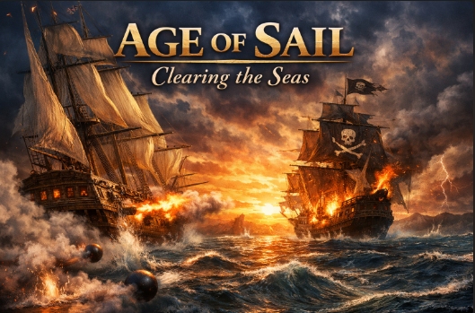 Age of Sail: Clearing the Seas is a tactical naval combat game set during the golden age of piracy. Command your ship across hostile waters, engage enemy vessels in cannon combat, dock at ports to repair damage, and survive encounters with legendary pirate threats.