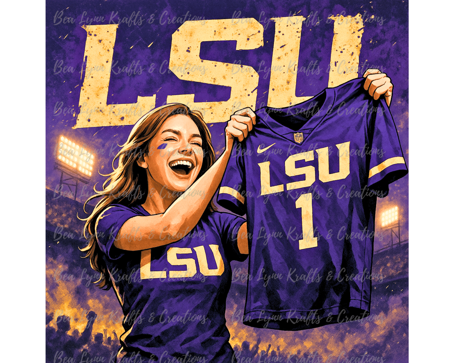 This super hyped LSU transparent PNG captures the spirit of Tiger Nation like never before! Featuring a passionate female fan holding up an LSU #1 jersey in a roaring stadium, this design is all about energy, pride, and purple-and-gold power. Whether you're tailgating, repping on game day, or decorating your shop with fire LSU fan gear — this graphic delivers instant hype.