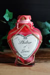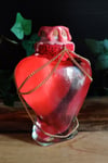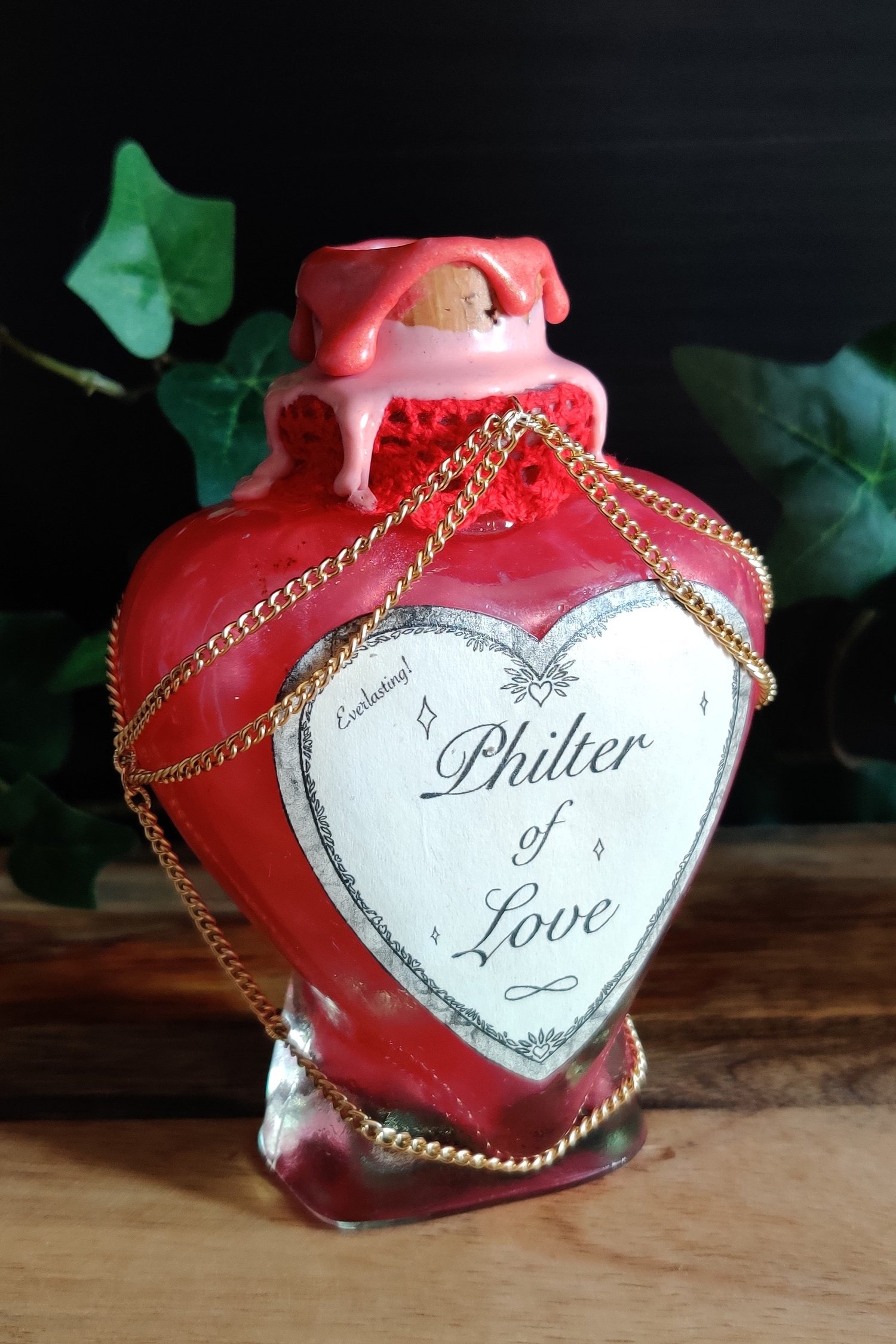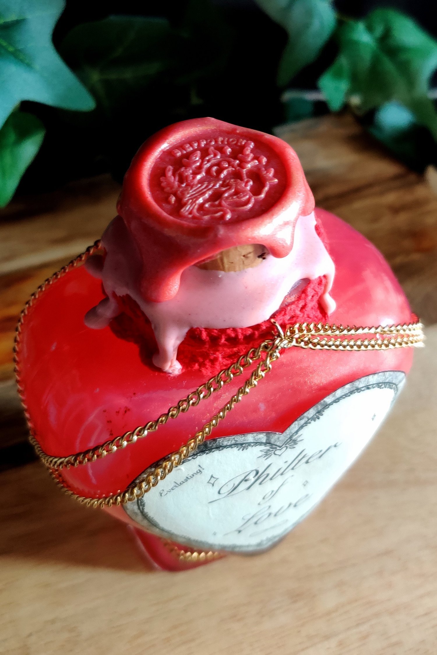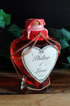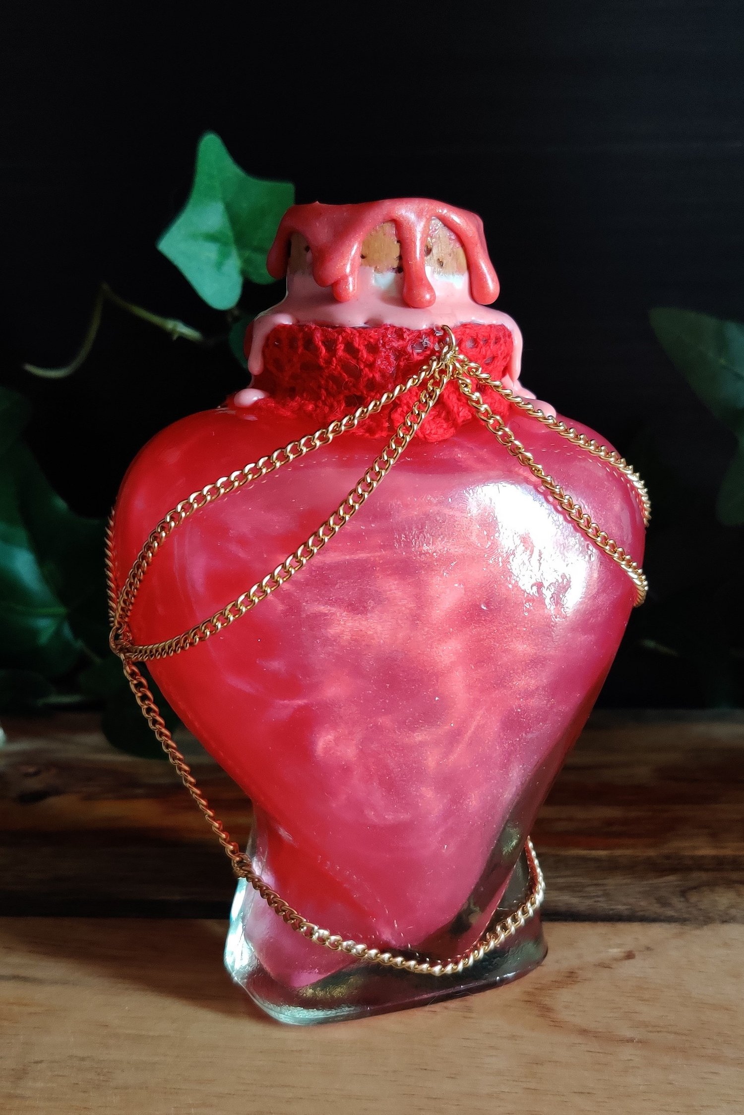 Pullossa on punertavaa nestettä ja se on koristeltu käsintehdyllä etiketillä, pitsinauhalla sekä kultaisella ketjulla.