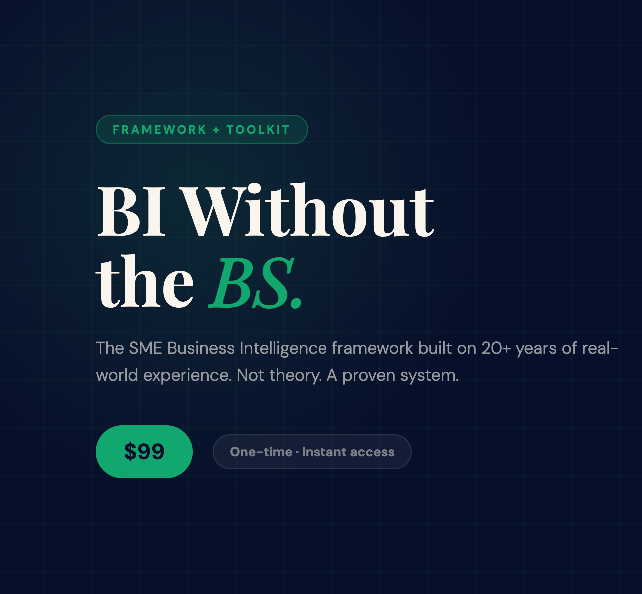 It's a 7-chapter business intelligence framework written for people who run businesses — not IT departments. No jargon. No theory. No consultant required. Just a clear, proven system that shows you exactly what to measure, how to structure your data, and how to turn it into decisions that move your business forward.