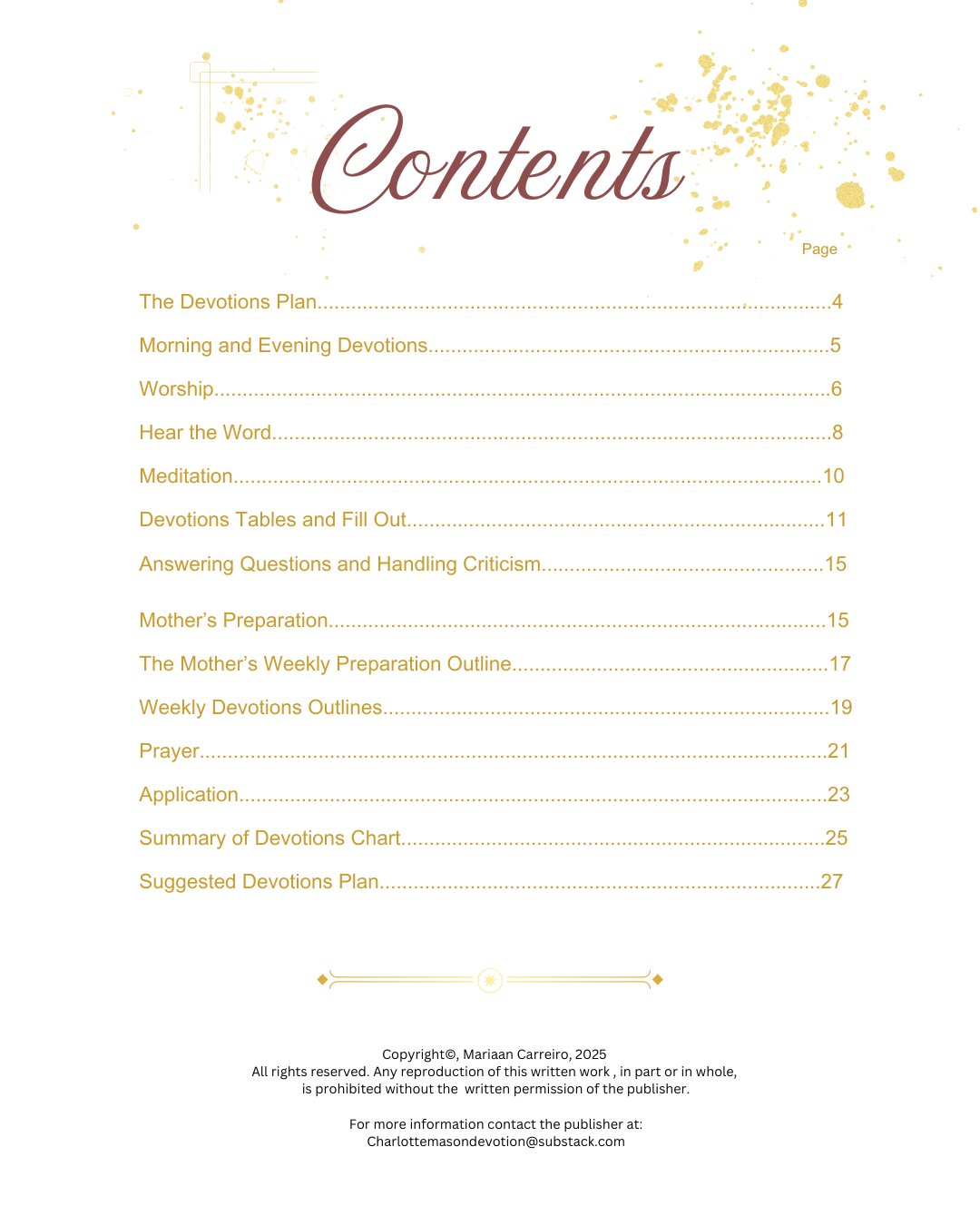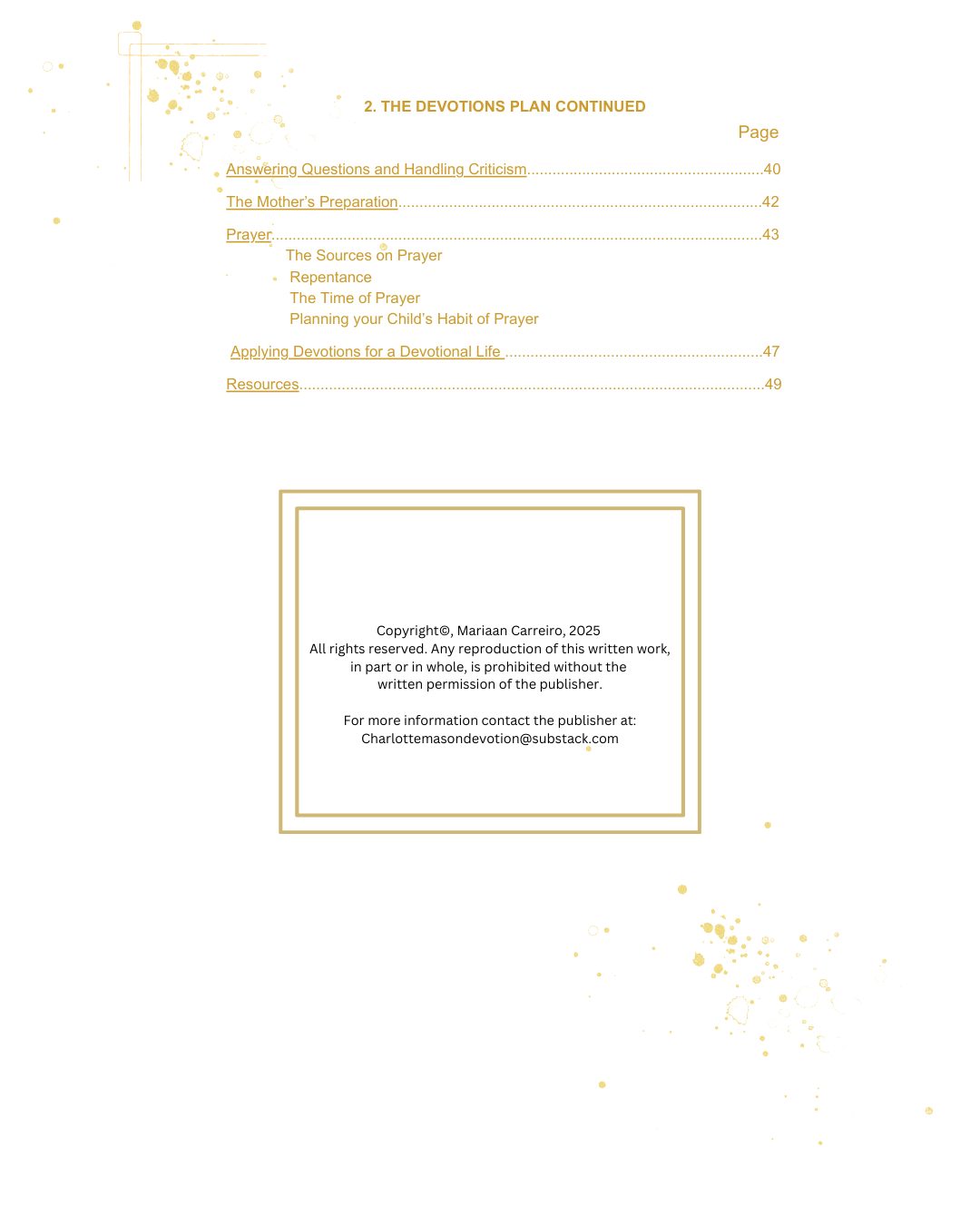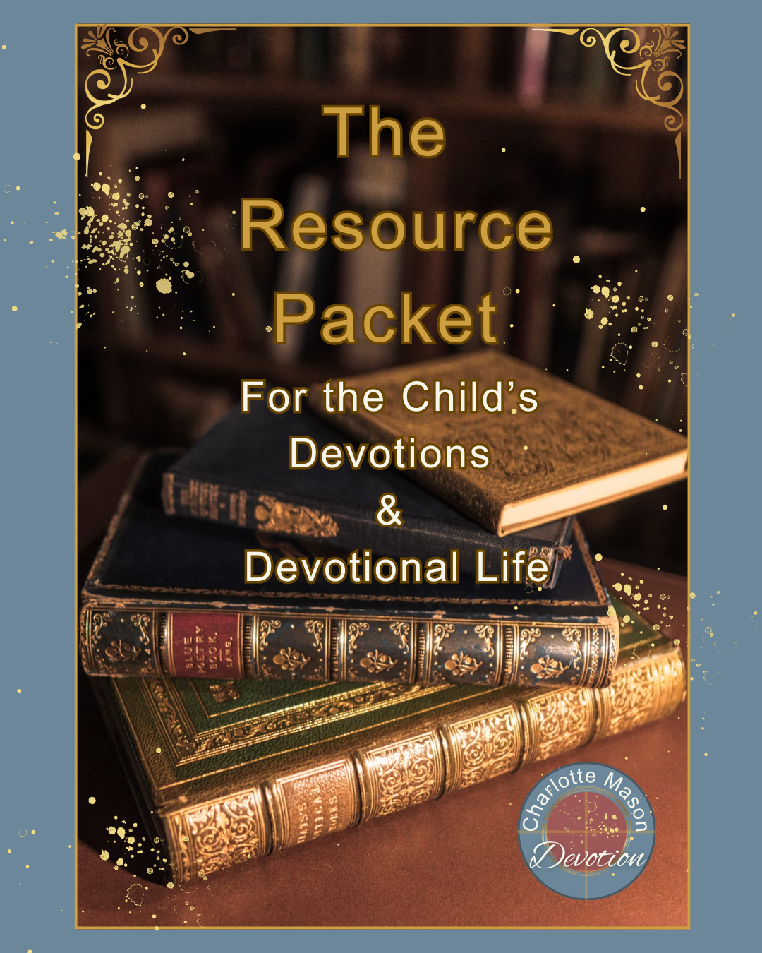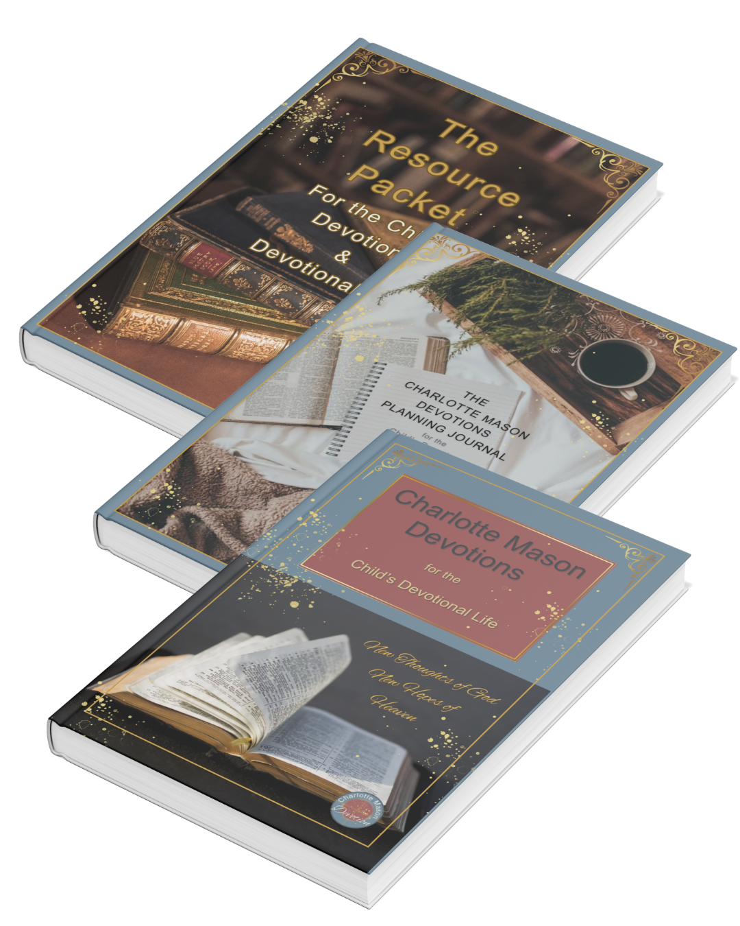 In this plan, Charlotte Mason Devotions for the Child's Devotional Life, I use as its sources the writings of Miss Mason on the child's religious education and "some unconsidered aspects" in their religious training in volume 1 and 3 as well as three articles for the Religious Education of Children in the Home. These articles were published in Miss Mason's Parent's Review of September 1906. They aid in and supplement the parents' efforts in the child's devotions for the devotional life. One article provides a full plan for devotions according to the ages of the children, another covers introducing prayer to children, and Miss Mason wrote the third article on meditation for children. These articles were personally selected by Miss Mason to aid parents in establishing the habit of devotions and other religious habits in their children. They contain all that the parent needs to plan, set up, start, and continue their child's devotions consisting of worship, Bible reading, meditation, and prayer.