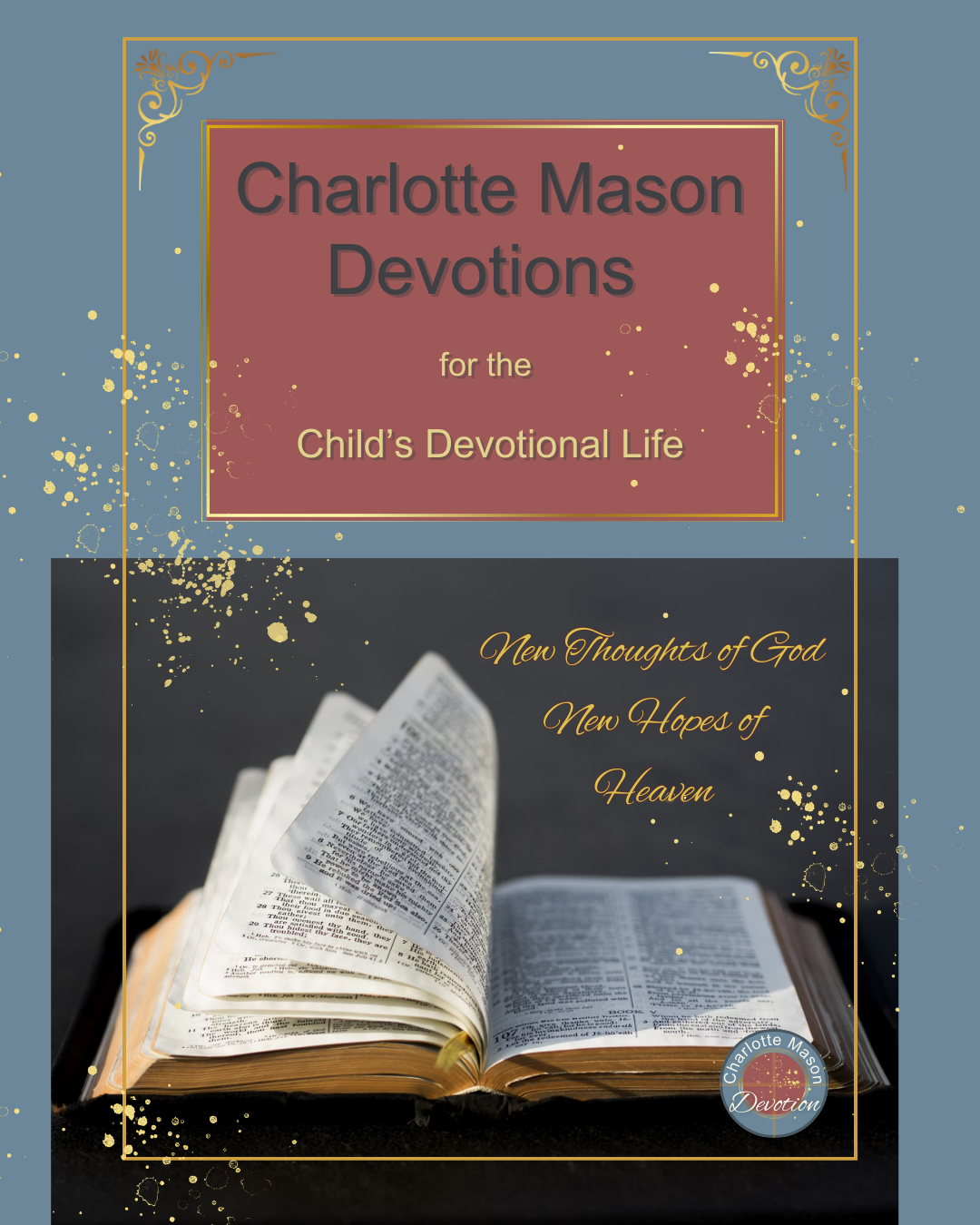 I took Miss Mason's writings on the child's spiritual education as well as the writings of 3 articles on the Religious Education of Children in the Home, to put together a step-by-step method for your child's devotions: The Charlotte Mason Devotions for the Child's Devotional Life. This plan may be used from the time they can sit and listen to you read or tell a little bit of the Bible to their teen years and beyond, when they will carry on their devotions on their own. This plan offers a blueprint map to parents on what the child's devotions and religious habits training need to consist of, how to introduce these ideas, and how to proceed until the child carries these habits on for himself.