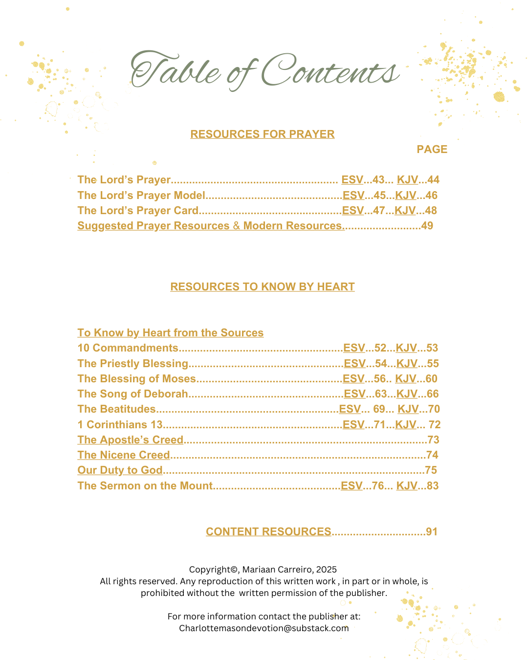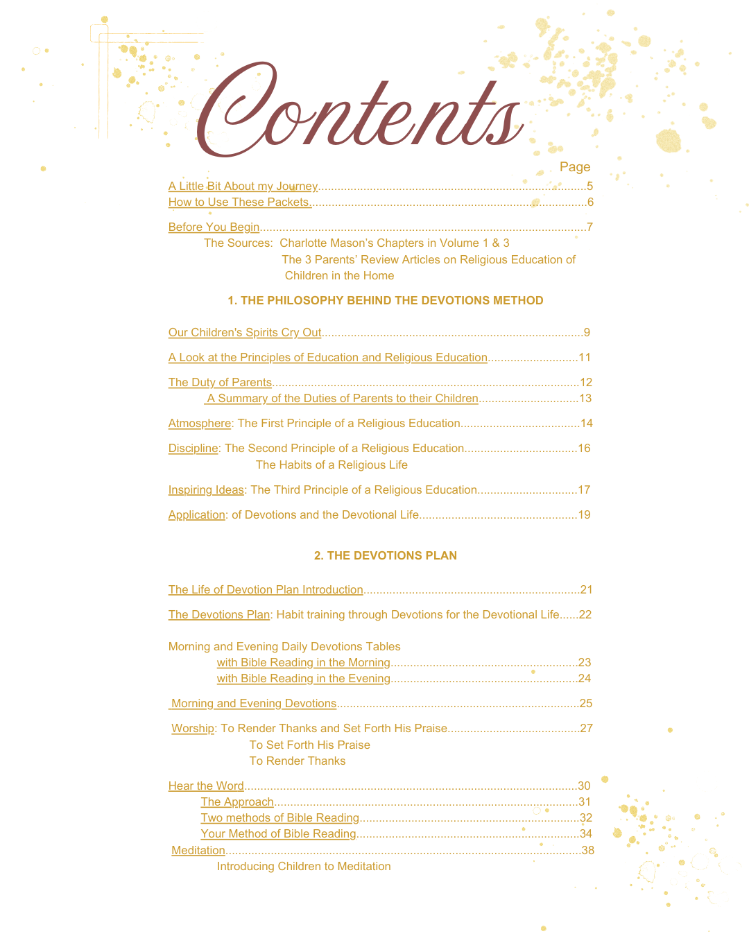 This PDF contains three documents The Charlotte Mason Devotions for the Child's Devotional Life packet, The Charlotte Mason Devotions Planning Journal, and The Resource Packet. There are over 150 pages to guide you along your way. The Charlotte Mason Devotions packet explains the philosophy behind the method and contains a Devotions Plan to help the parents understand and set up devotions for their child's/children's devotional life to the Lord. The Planning Journal contains pages for planning with sample schedules and tables as well as writing space to answer the questions posed in the Charlotte Mason Devotions packet. I have also included a free resource to take you through your first year's daily Bible readings. The Resource Packet contains all the Bible passages (in ESV and KJV) and other aids mentioned by the 3 authors from the sources. I have also provided links to more modern resources if you would like to use them.