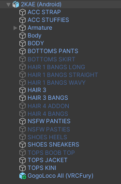 2kae includes; 35-75 Base Toggles, 121ish Toggles Combined. 40 Hair Combinations, 10 Hair Mat-Swaps on hair + bangs, Hair Hue, Clothing + Eye Hue, + Matswaps + 4 Skin Matswaps. Bones and Colliders where they need to be (Hands, Spine, Chest) (Hair, Ears, ETC)