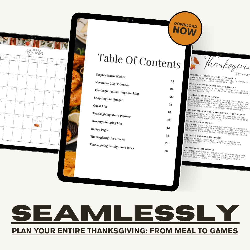This instant-download digital planner is your ultimate Thanksgiving hosting companion — whether you’re a first-time host or a seasoned pro. It walks you through every step, from budgeting to brining, so you can focus on what really matters: good food, good company, and great memories.