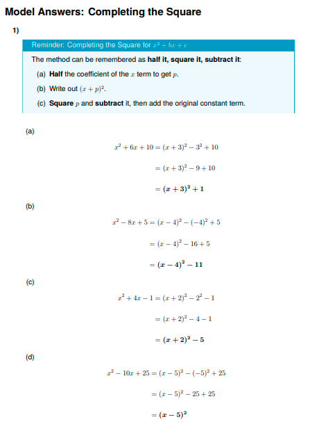 IGCSE Higher Maths: Completing the Square (Worksheet & Model Answers)