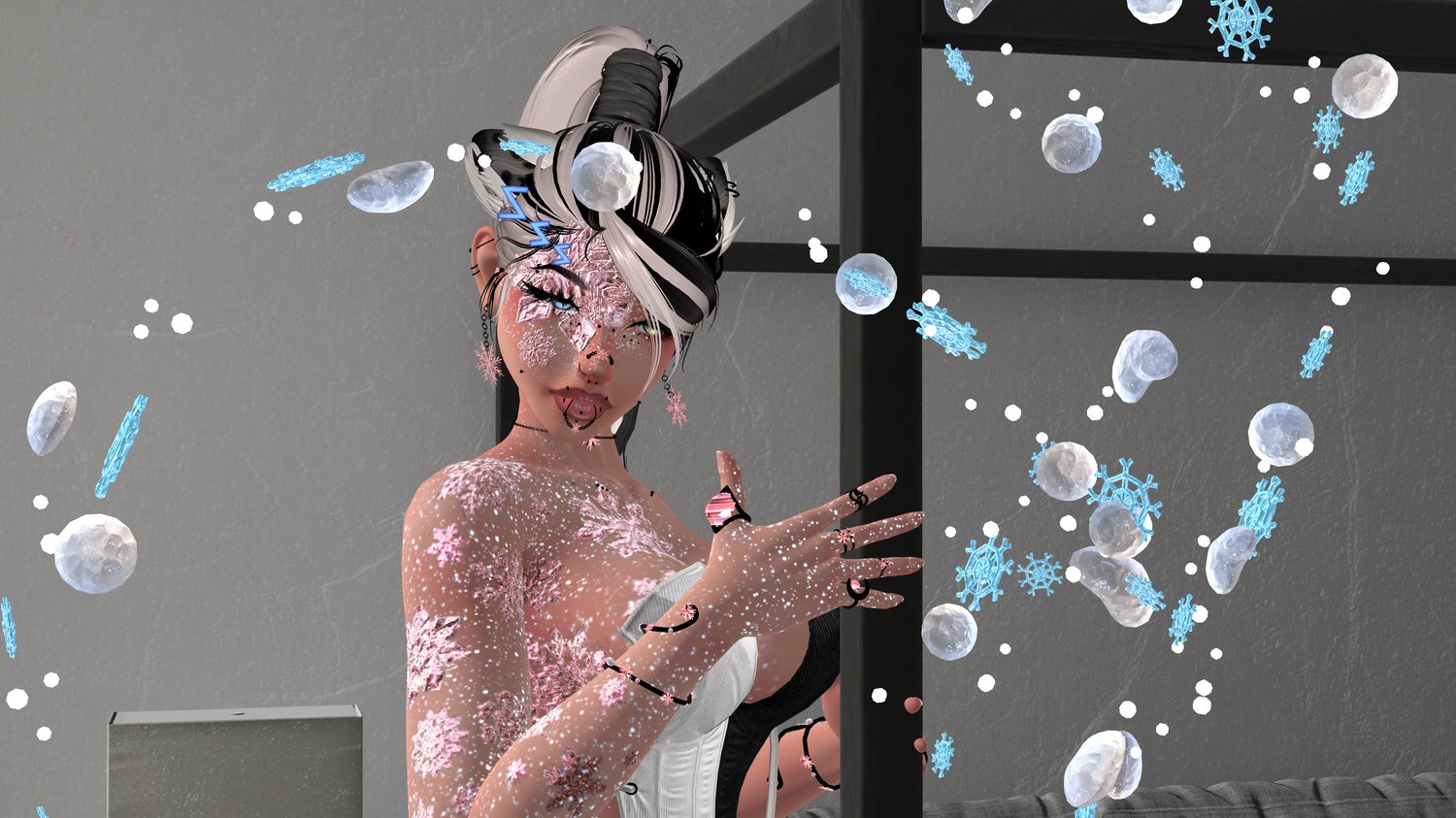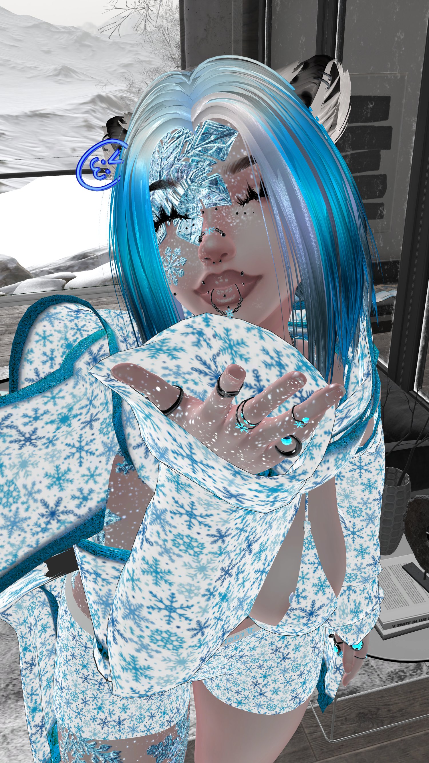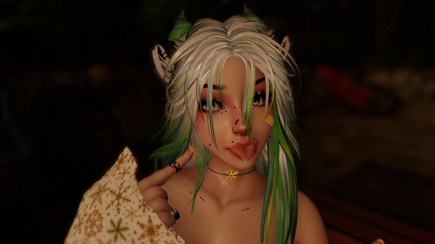 - Ski Goggles(move to forehead), Bandaids, Scarf, Leg Lace, Mask, Face Harness, Face Piercing Set, Leg Chain, Arm Chains, Wolf Cloak and Neck Fur, Body Piercings, Slavic Hat, Ice Queen Set (Choker, hip chain, belly piercing, rings, bracelets), Stacked Rings