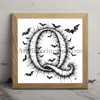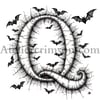 The letter Q coloring book halloween occupying 90% of a 1024x1024 image. Use an Old English font style with clear outlines resembling a coloring book page. The character is composed of intricate bat silhouettes, creating a spooky Halloween atmosphere. Use only pure black (#000000) for the character and outlines, and white for the background.2D, black and white style resembling a high-quality adult coloring book page.