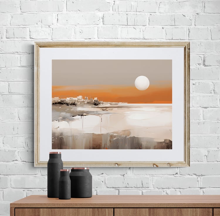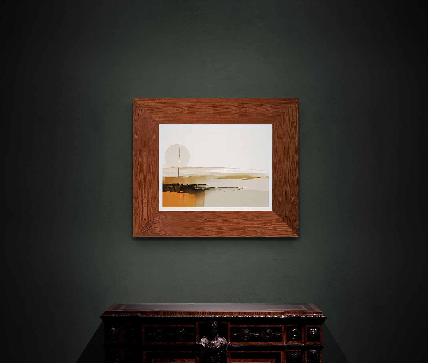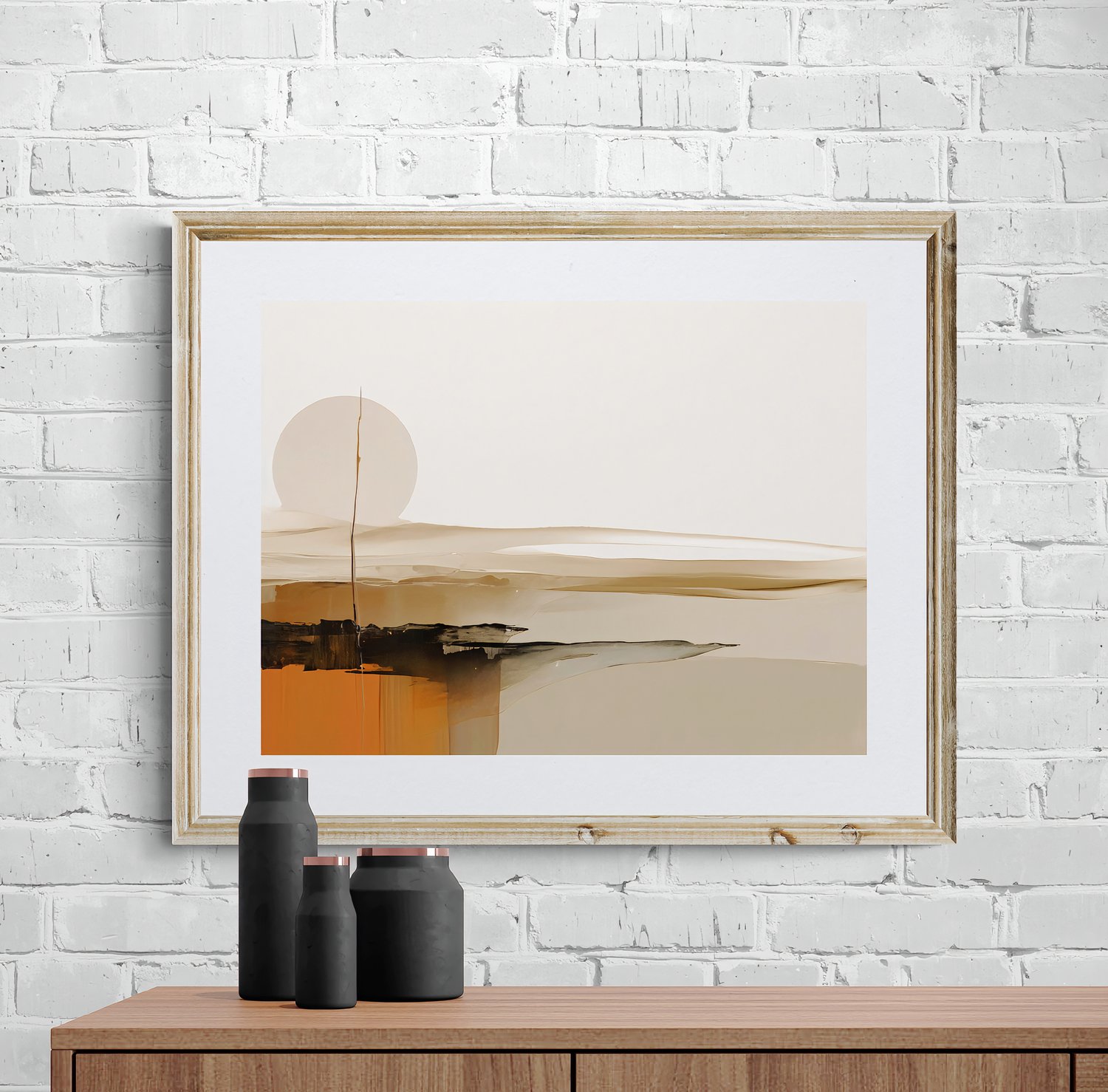 Visual Elements: This piece explores the profound beauty of isolated landscapes. The interplay of light orange and dark amber captures the quiet warmth of a beach at dusk, while the use of white and light brown lends a soothing, airy feel.