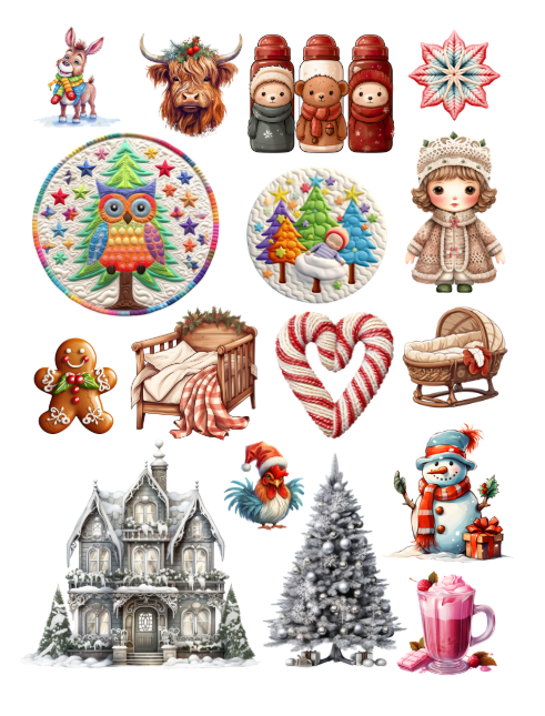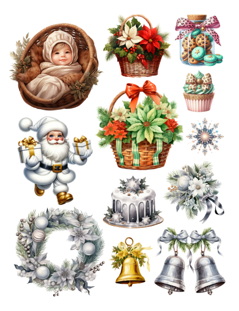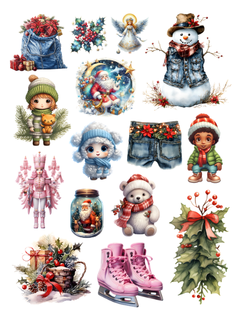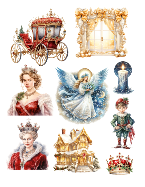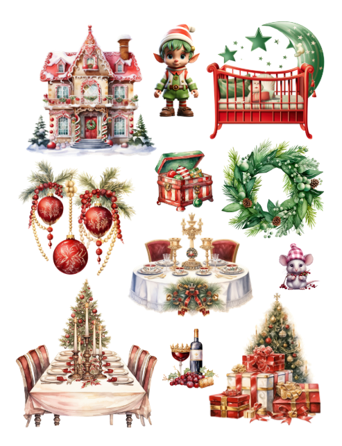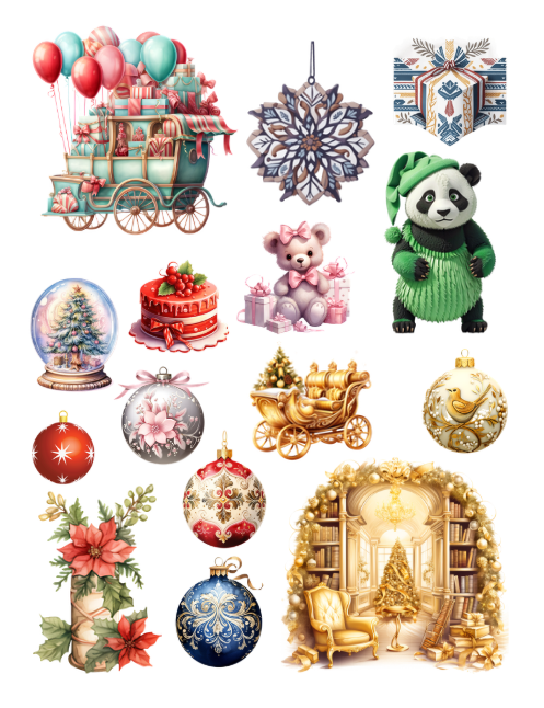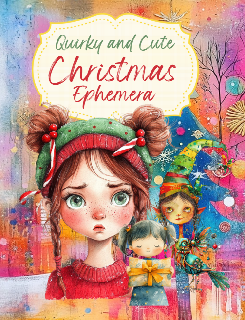 Pull out your scissors and glue and dive into the magical world of lovely Christmas ephemera with this artistically beautiful cut and collage book. Animals, sleighs, hats, winter wonderland, deer, snowmen, window scenes, fireplaces, teddy bears, coffee, stockings, ornaments, cake, gnomes, boba, Santa Claus, reindeer, frosted cookies, gingerbread houses, food, angels, silly characters, princess, crown, holly, bird, flowers, and happy people are featured.