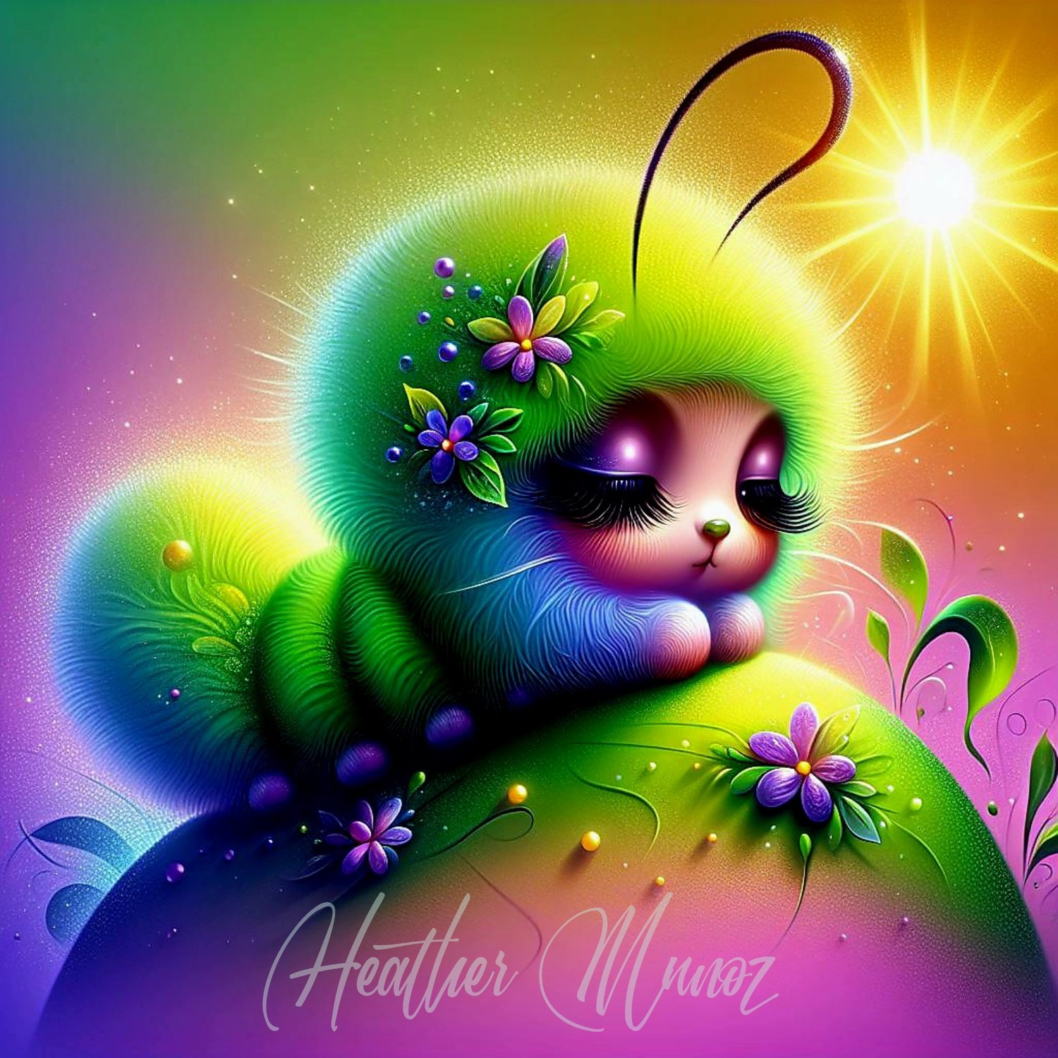 Gorgeous fuzzy Catapillar in lime green with yellow and purple accents, taking in the morning