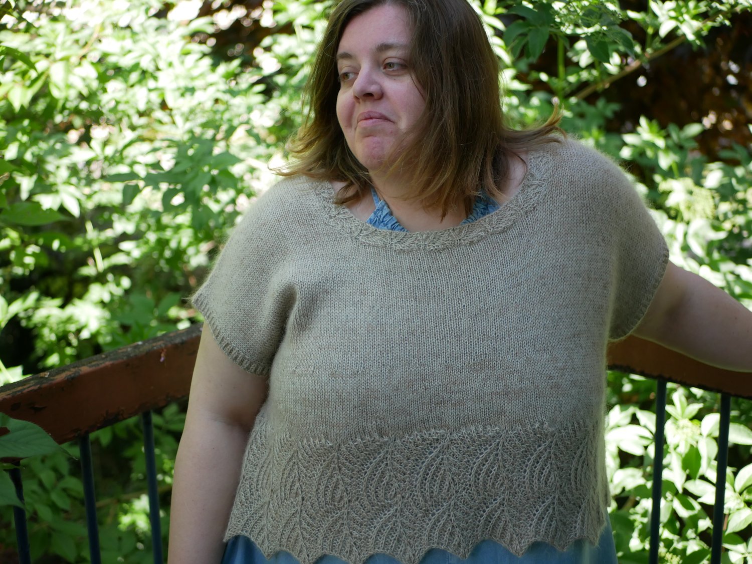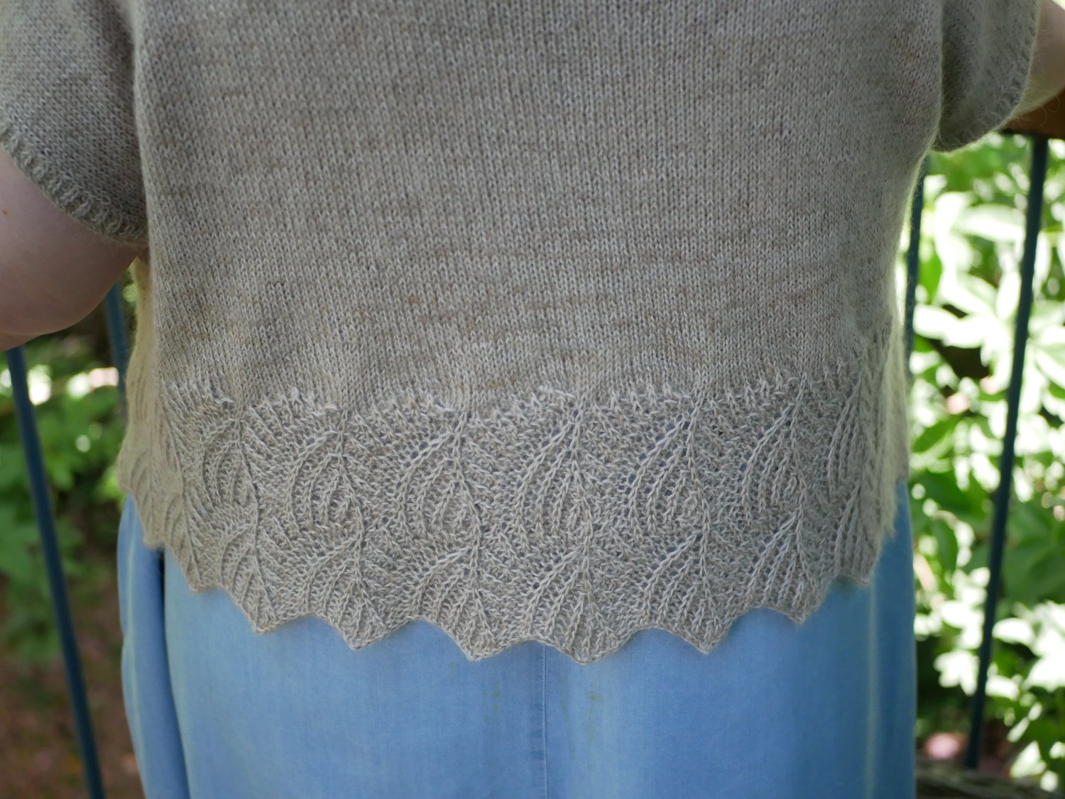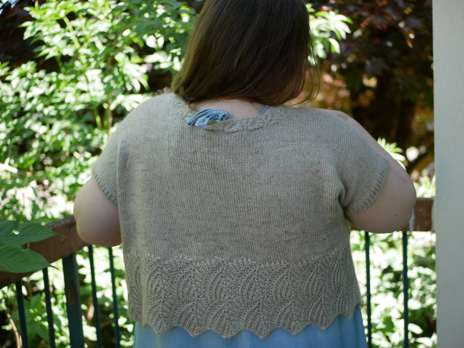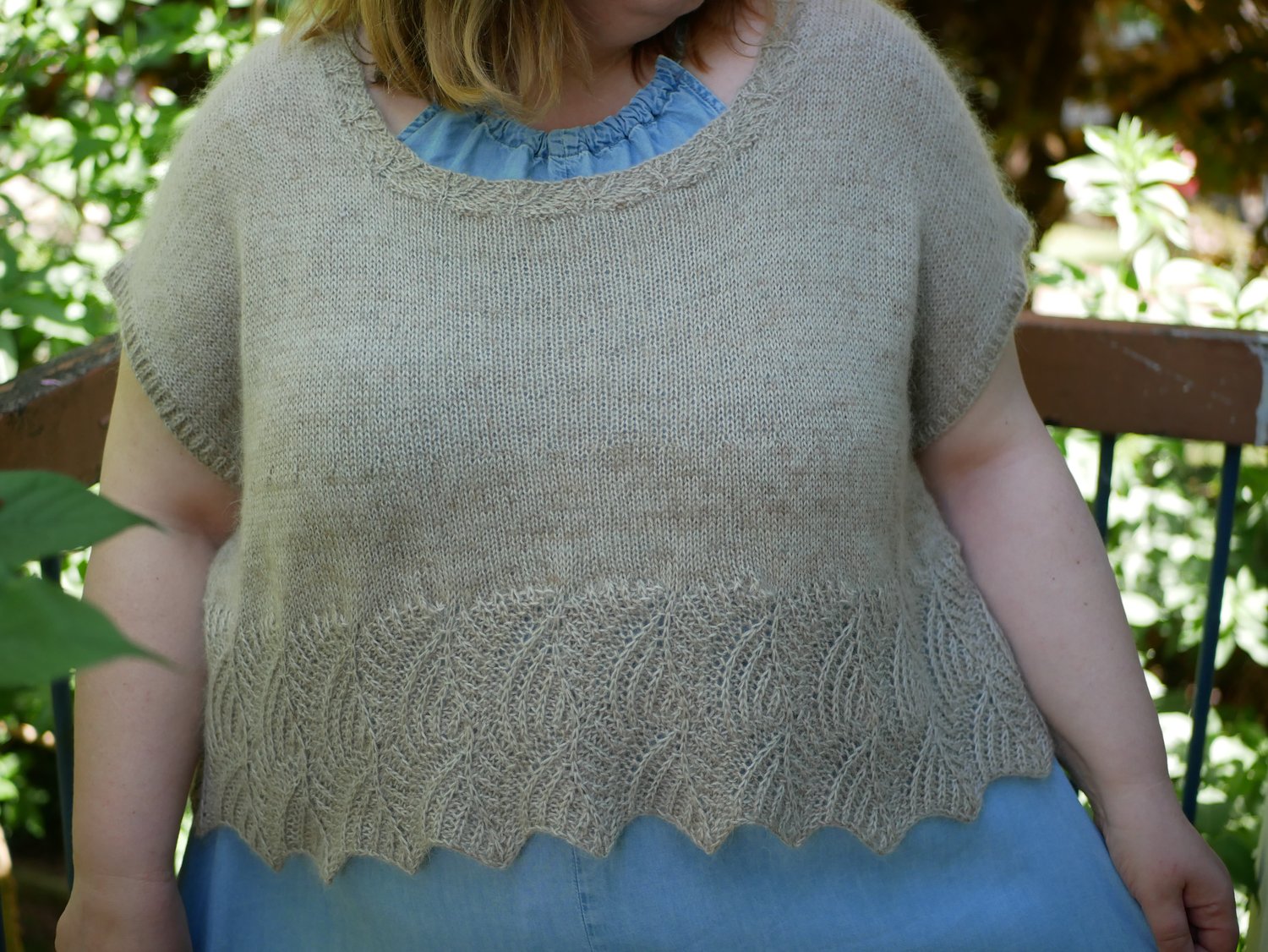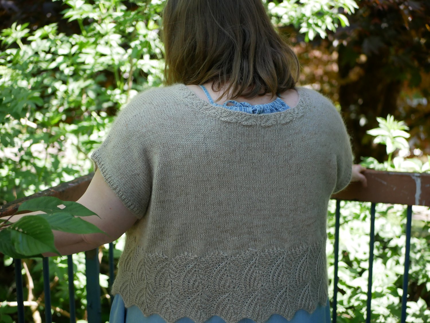 Tsih est un petit pull de printemps qui fait la part belle à un motif de côtes effet brioche. Il se tricote du haut vers le bas (top-down), selon une construction drop shoulders, essentiellement en rond.