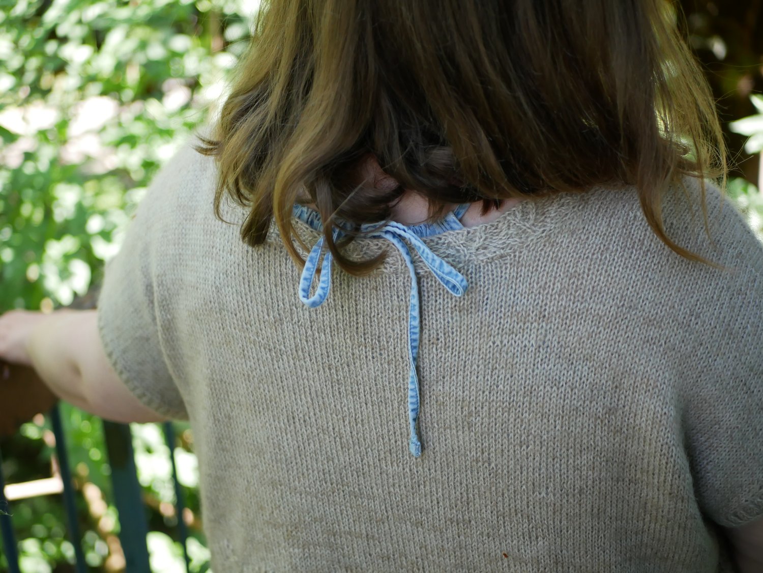 On commence par les épaules, via un montage provisoire, afin de les rabattre à trois aiguilles plus tard. Puis on tricote le corps en rond et on termine en fausses côtes brioche aux emmanchures et à l’encolure.