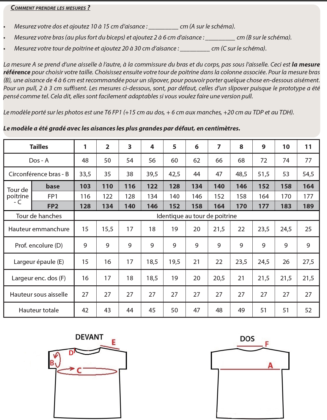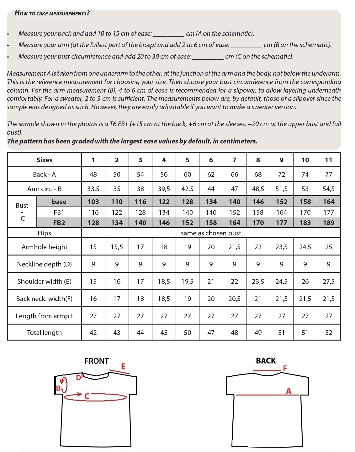 Ce modèle est gradé selon la mesure dos pour un porté seyant et propose trois possibilités de tour de poitrine par taille. Deux encolures sont possibles : ronde avec motif, ou carrée avec des côtes. Des indications sont également données pour lui ajouter des manches longues.