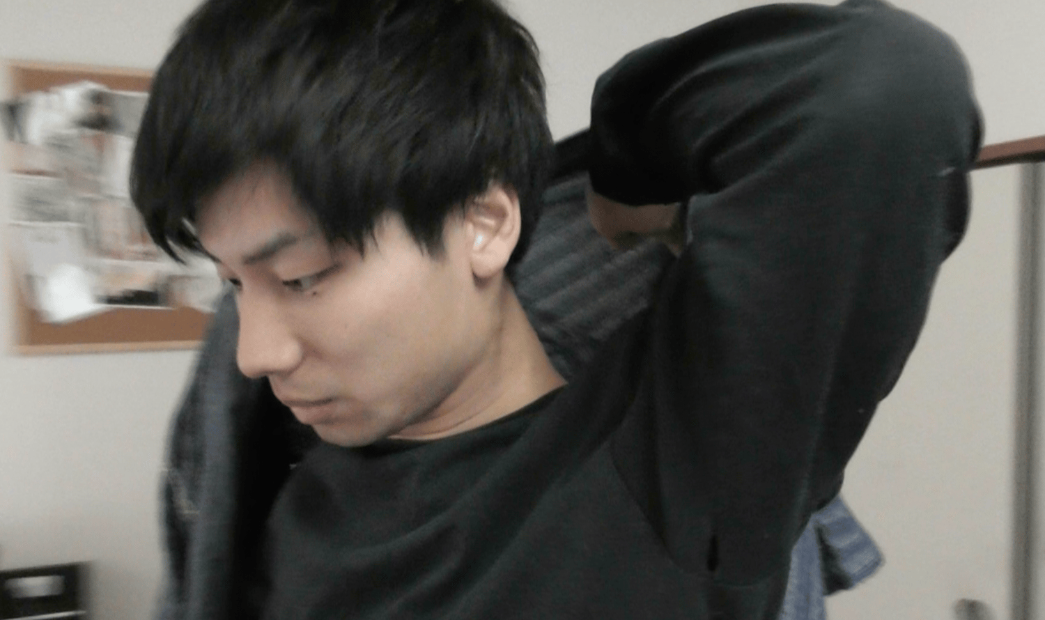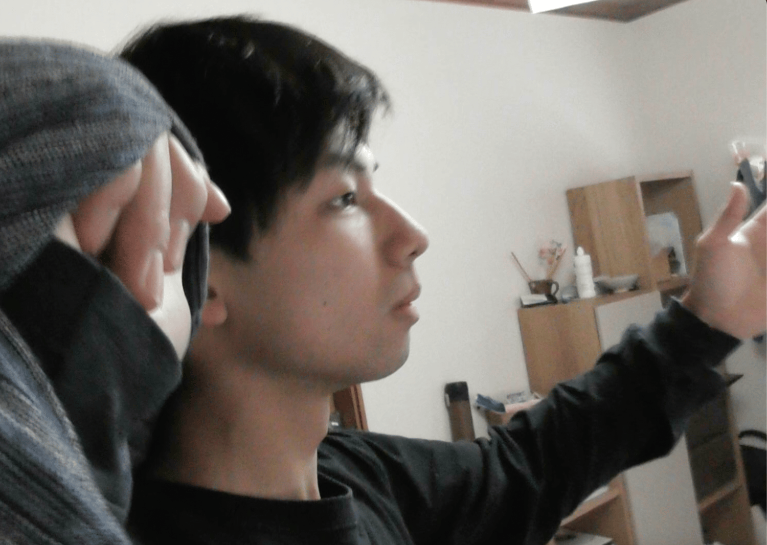 Taku comes back to visit. I offer him a kimono and then freeze him just before he can wear it. Taku is always good at freezing. Enjoy hand and mouth play.