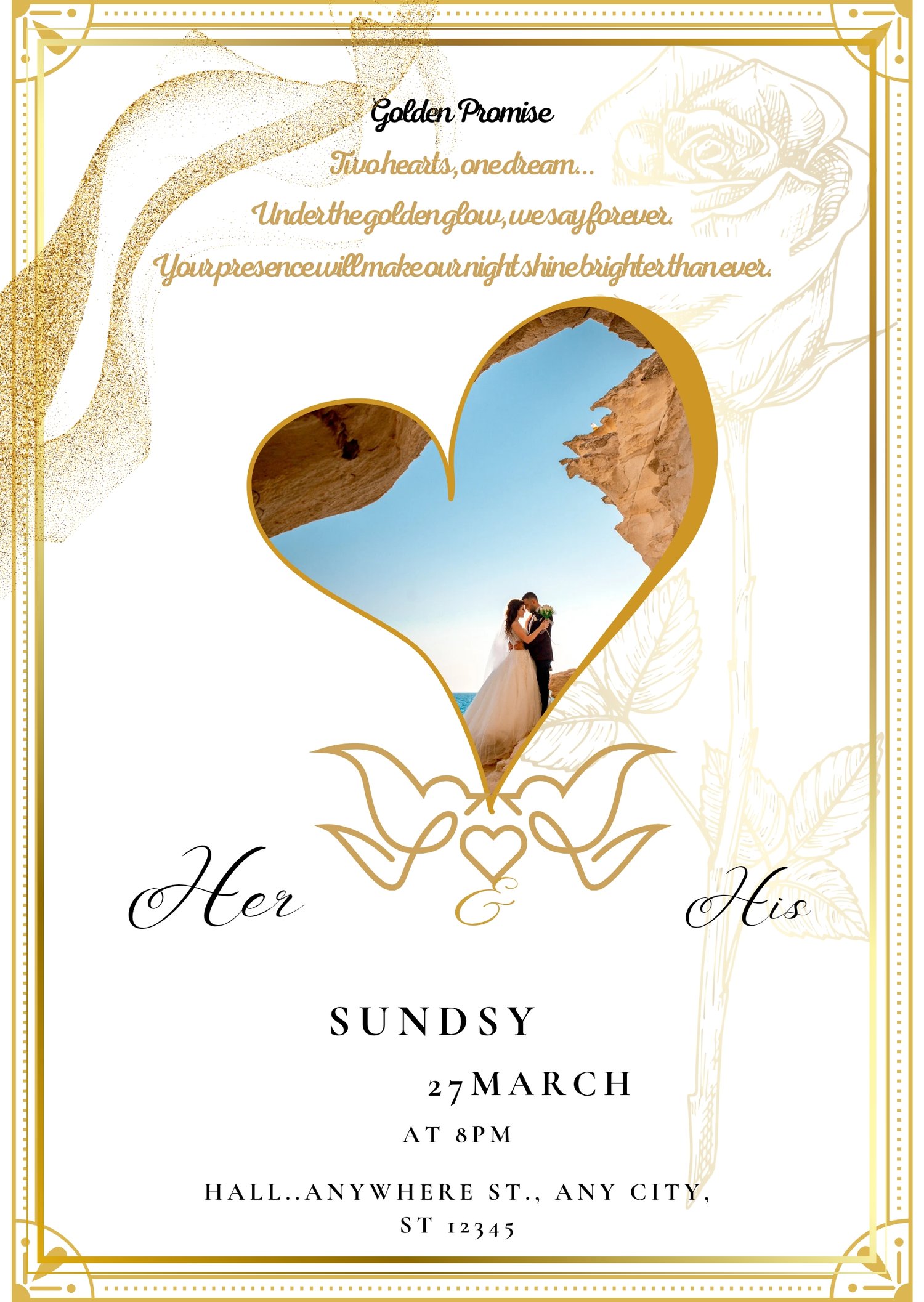 This golden-themed wedding invitation features a romantic heart frame for the bride and groom, shimmering gold accents, and a warm, heartfelt message. Perfect for sharing your wedding details with loved ones in a stylish and unforgettable way.