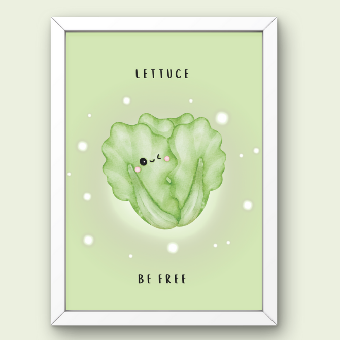 Sprout a little freedom and fun with this leafy green digital poster! Featuring a happy head of lettuce and the empowering pun "Lettuce be free," this print adds a fresh twist to your space while spreading a positive, lighthearted message. Perfect for kitchens, classrooms, wellness spaces, or anyone on a journey of self-love and liberation.