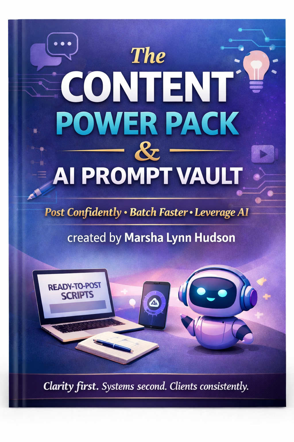 The Content Power Pack & AI Prompt Vault is a clarity-first content system designed for coaches, speakers, consultants, and service-based entrepreneurs who want to post consistently, sound confident, and attract the right clients — without feeling salesy or overwhelmed.