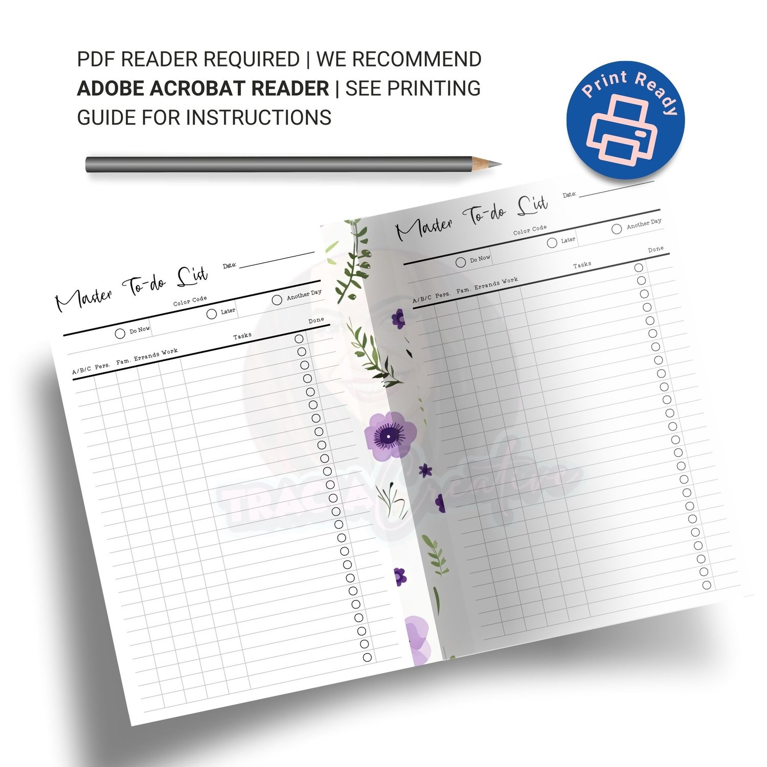 Purple Floral Master To-do List Planner Insert - Printable Digital Download PDF