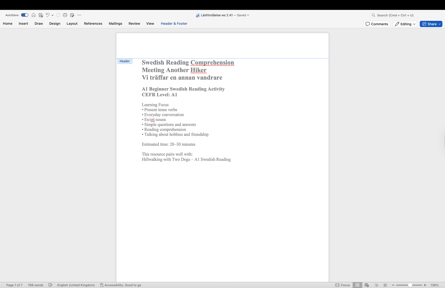 This A1 beginner Swedish reading activity continues the story from Hillwalking with Two Dogs and introduces simple conversational language and themes of friendship.