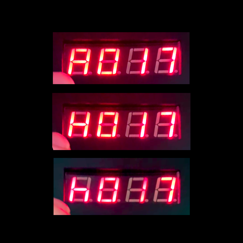 * Verifique, desde el display del equipo, que permita colocar la direccion dmx con las letras "A", "H" y "h" (cuarta foto).