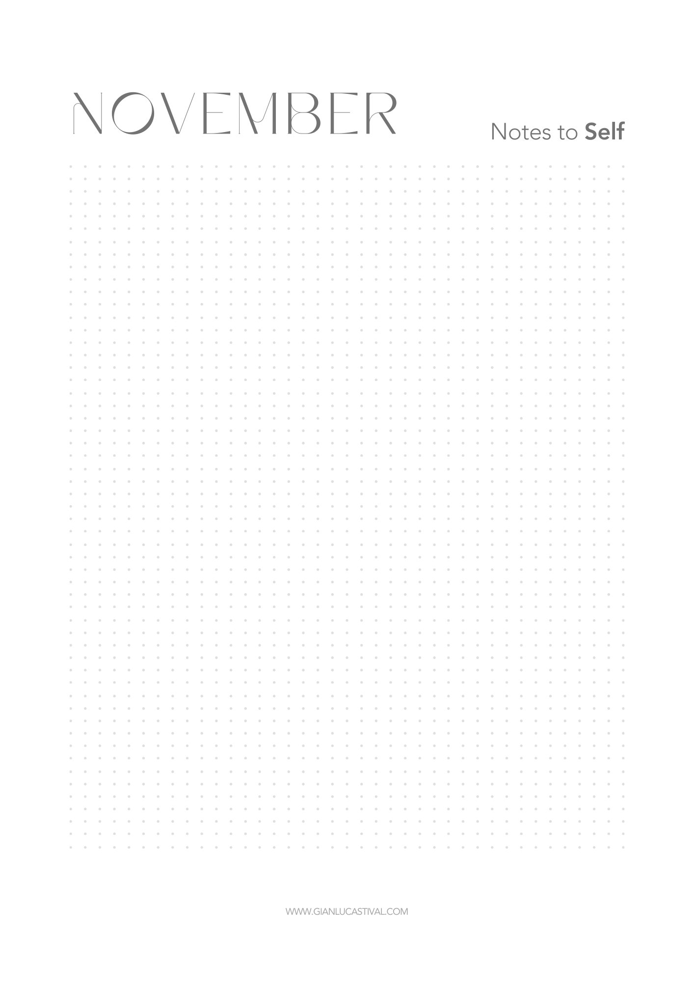 Ogni mese include una struttura di calendario per segnare giorni e tempo, accompagnata da una pagina “Notes to Self”. Si tratta di una pagina volutamente vuota, pensata per appunti personali, riflessioni, promemoria o scrittura libera.