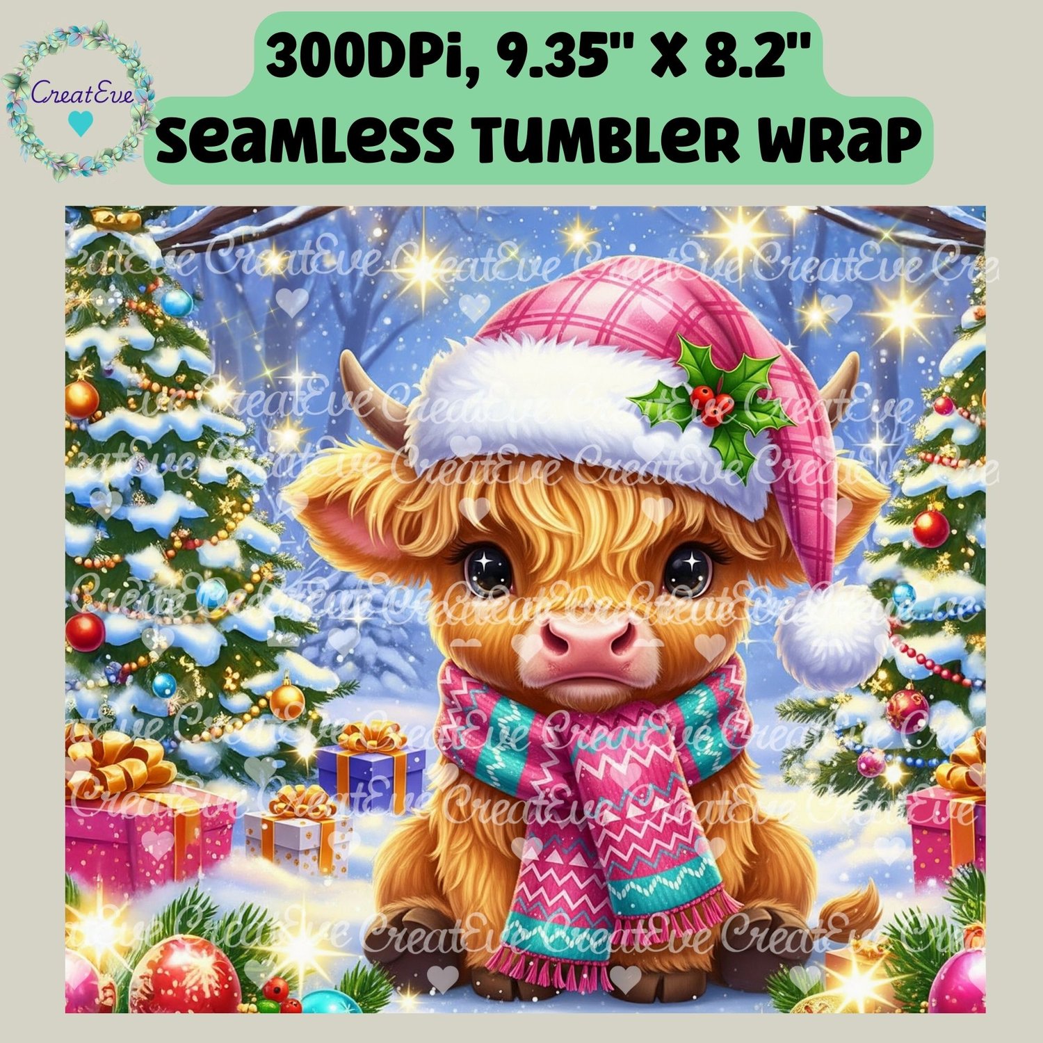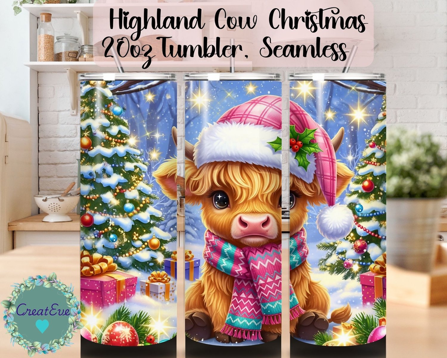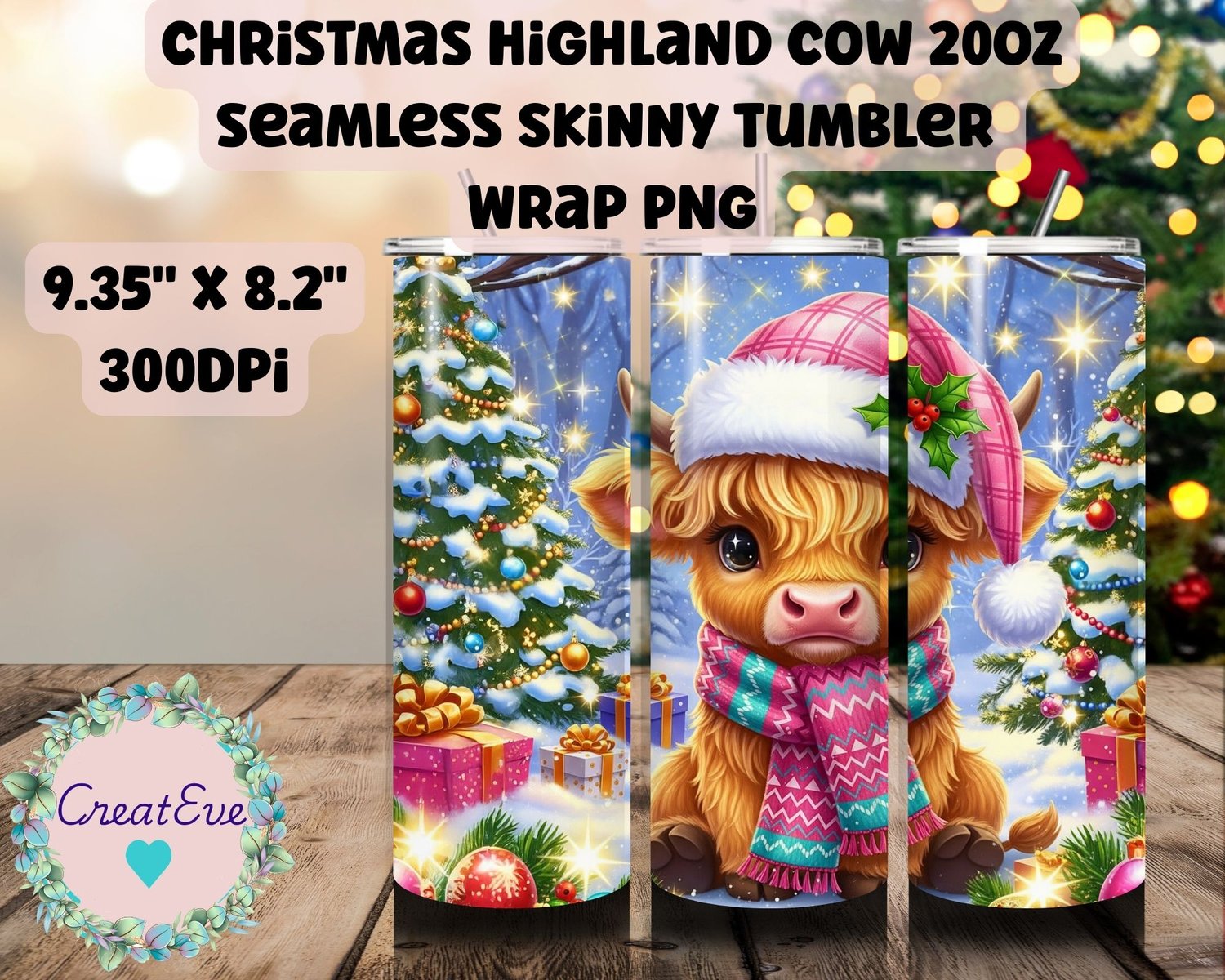 Highland Cow Christmas 20oz Seamless Skinny Tumbler PNG, 300dpi, 9.35" x 8.2"