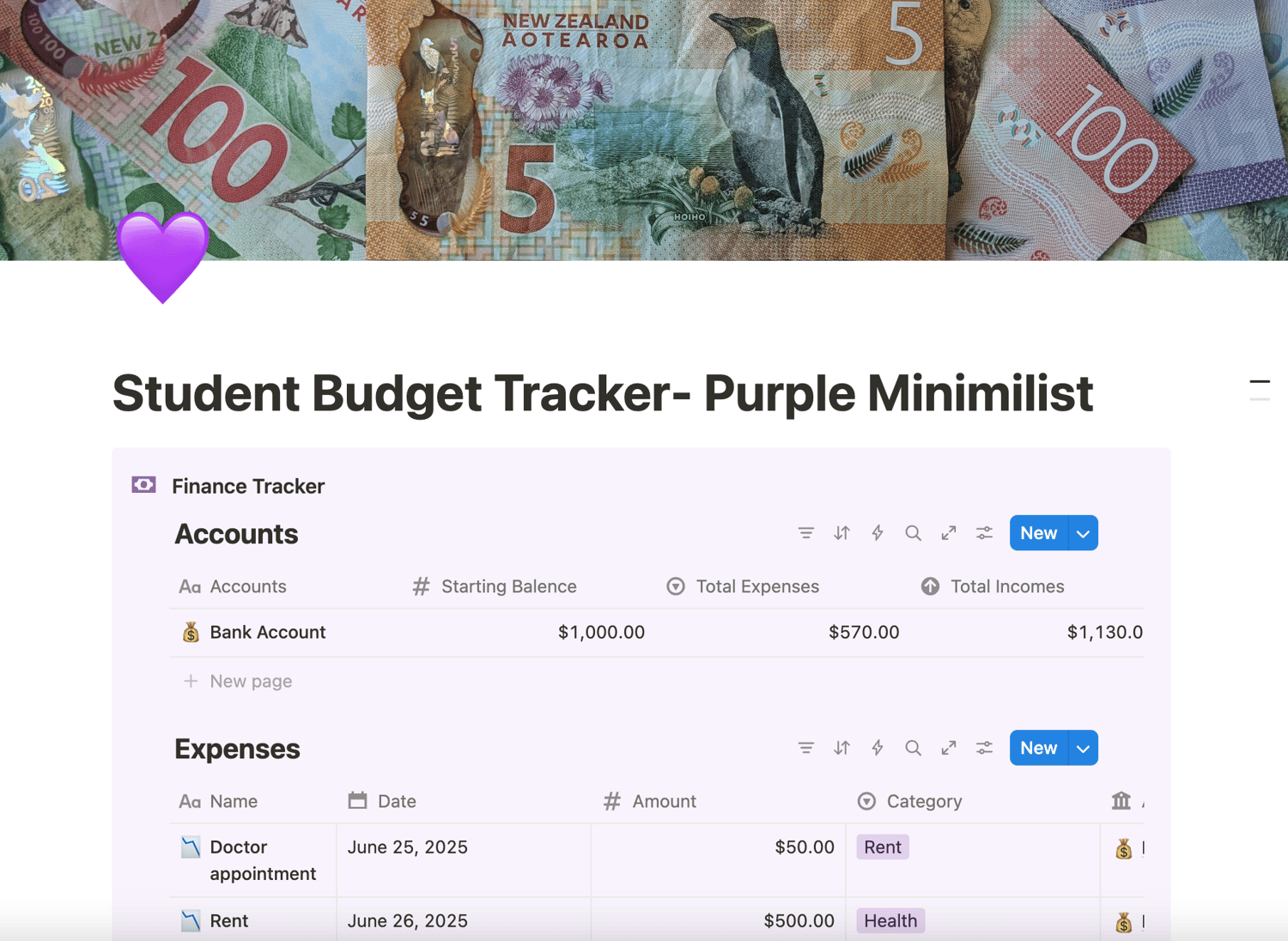 Minimalist Purple Finance Tracker — Notion Template
