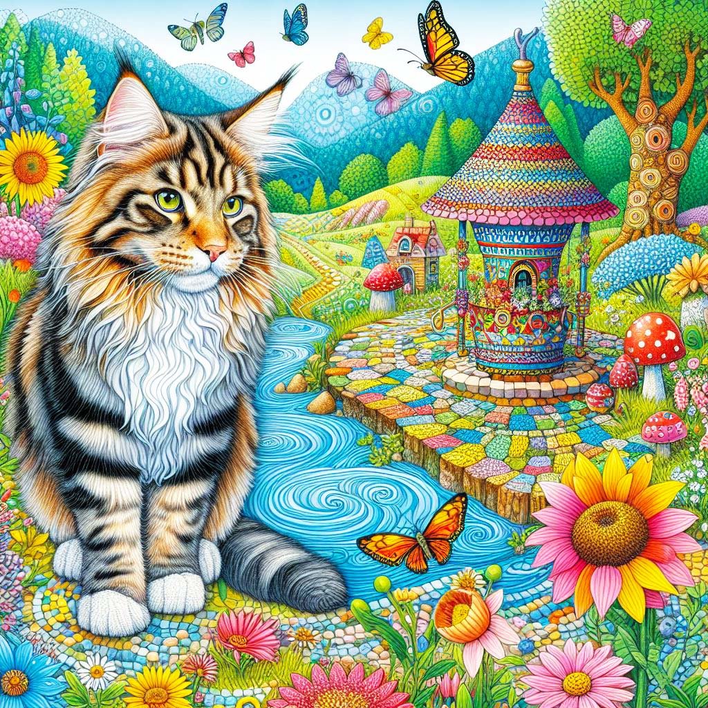 Maine coon cat beside a windy blue river. Hills are patterned with daisies, sunflowers, bluebells & poppies and colourful toadstools. There are Butterflies.