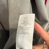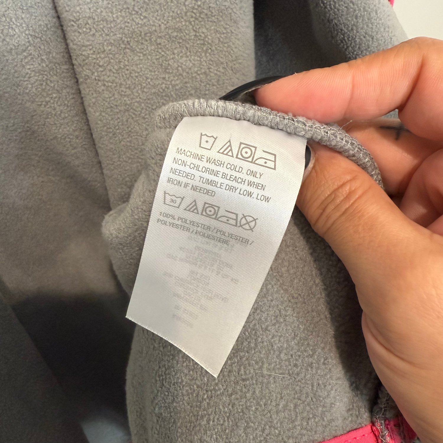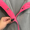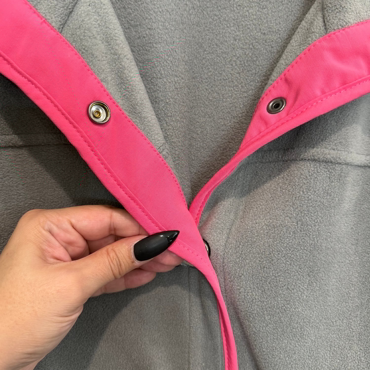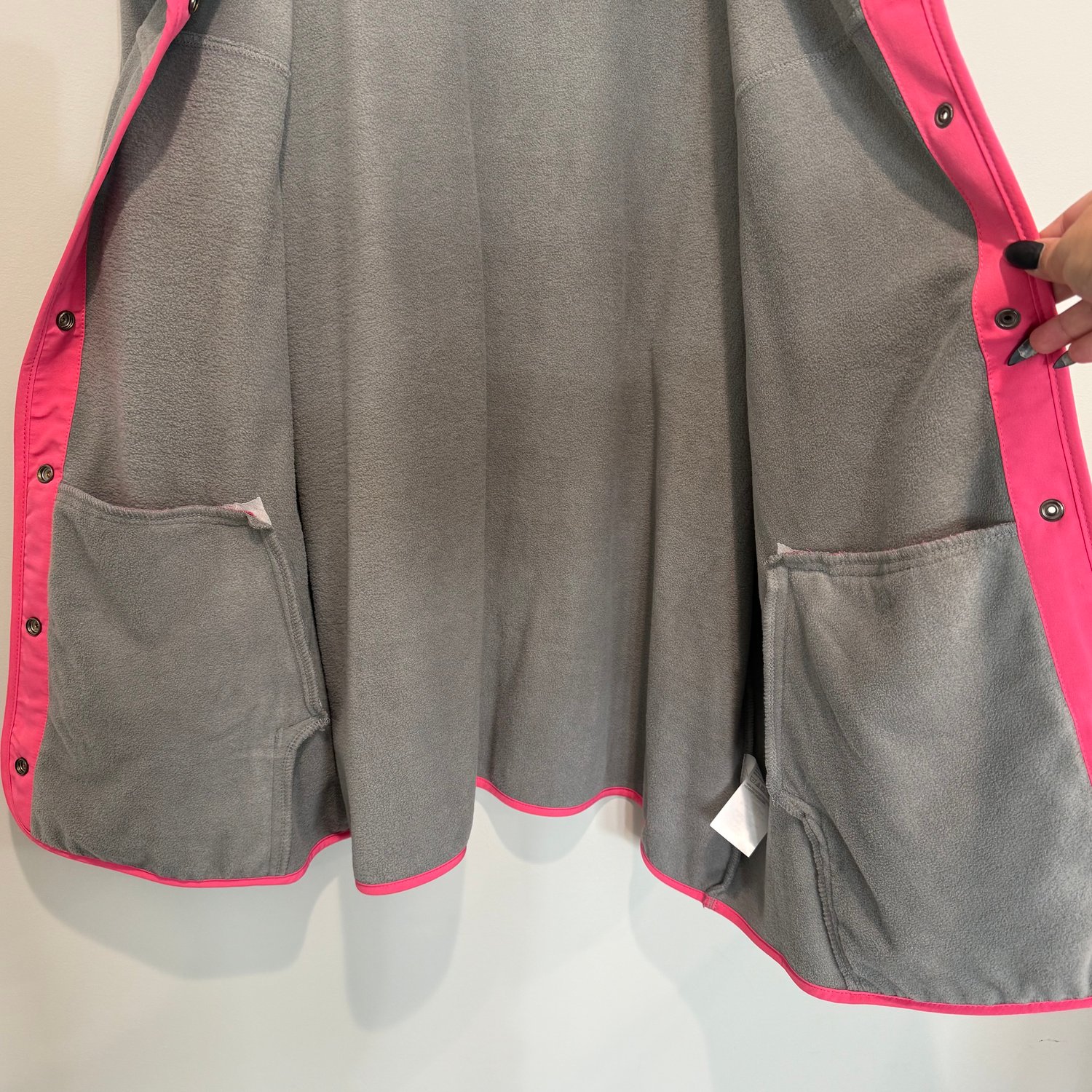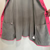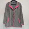 Susan Graver Weekend gray fleece with bright pink details, pockets and silver tone snap button down closure. It also has two inside pockets.