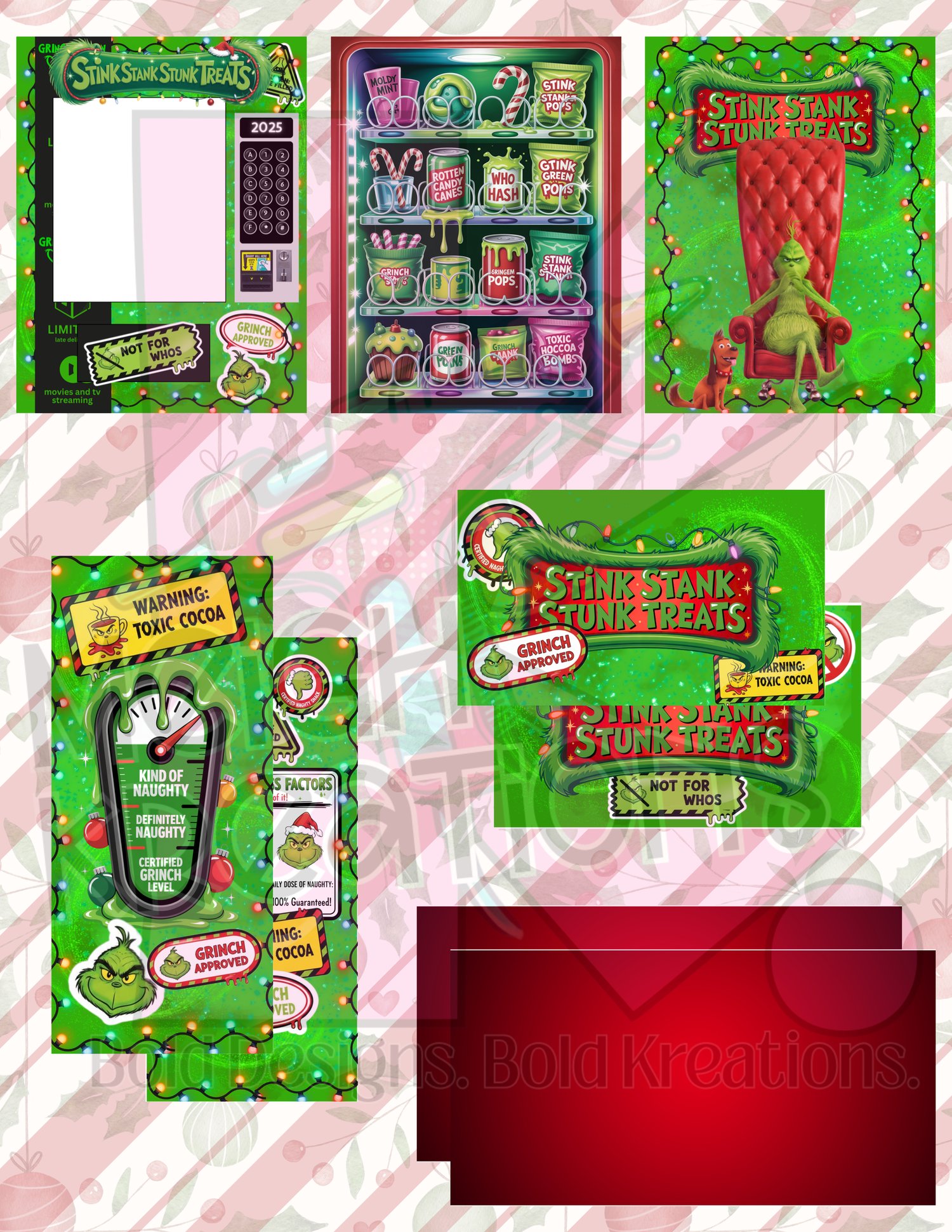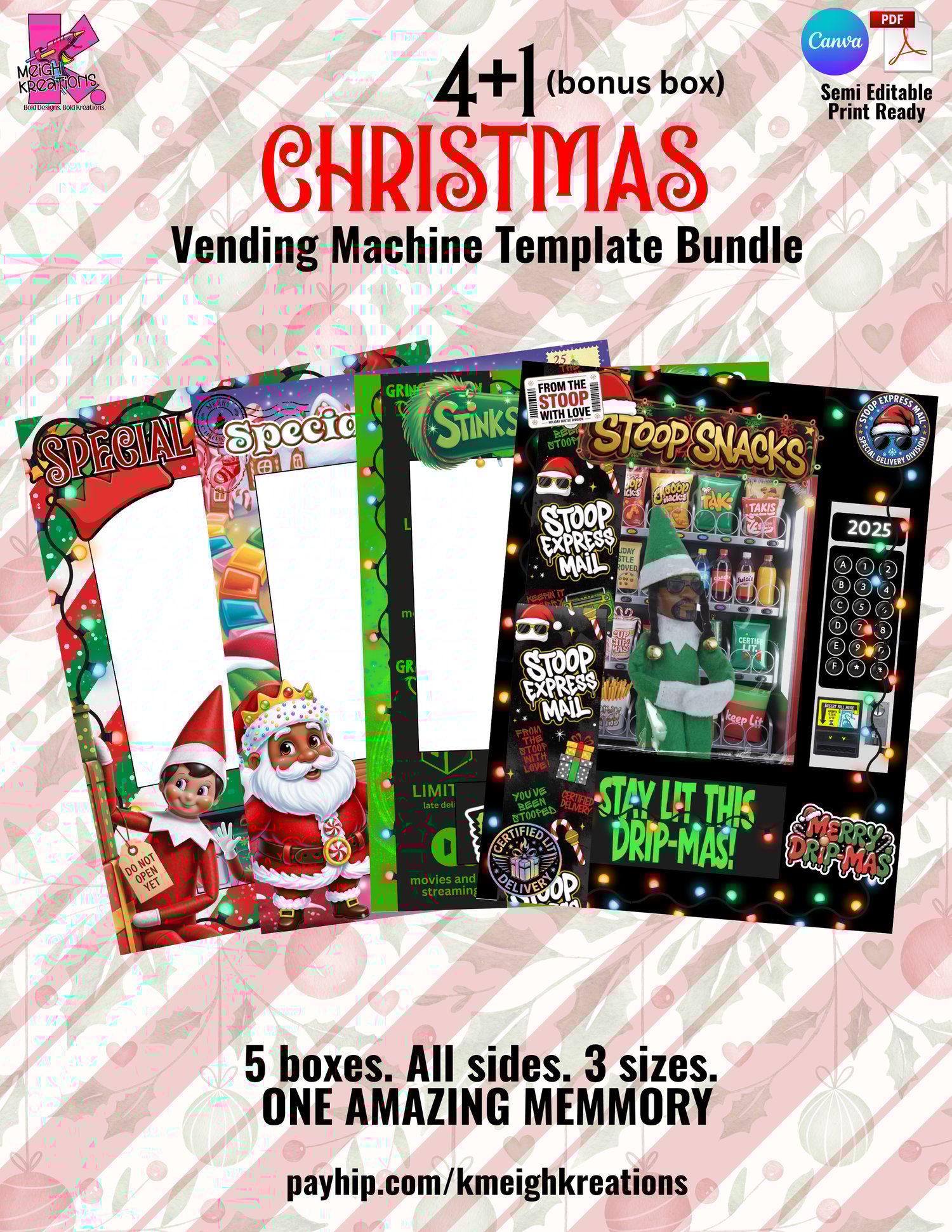 Bring the Christmas magic straight to your craft table with this festive vending machine template bundle. This set includes 5 fully designed boxes, featuring fun holiday themes like Santa, Grinchmas, Elf on the Shelf, and Stoop Snacks. Each box comes with all sides included and is available in 3 sizes, making it perfect for treat boxes, gift boxes, pop up vending machines, or custom holiday creations.