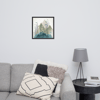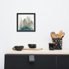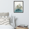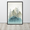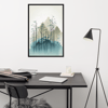 Immerse yourself in the tranquil beauty of nature with this stunning watercolor painting of a serene forest. Towering trees with minimal foliage are depicted in various shades of blue, contrasting beautifully against a beige silhouette of evergreen trees in the background. Tiny birds add a whimsical touch to the painting, adding to the sense of calm and peace.