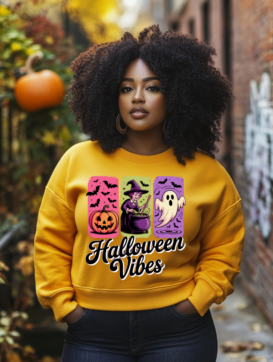 Bring the spooky fun to life with this Halloween Vibes digital design! Featuring a retro-inspired witch stirring her cauldron, a smiling pumpkin, and a friendly ghost with bats, this playful artwork is perfect for all your Halloween crafts.